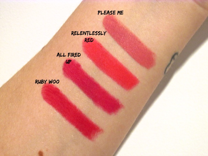 A mon anniversaire, ma soeur voulait m’offrir un rouge à lèvres MAC donc je lui ai dit de choisir entre le Russian Red et le Ruby Woo. Elle a finalement opté pour le second et elle a bien fait car le Ruby Woo est le rouge parfait que toute femme se doit d’avoir (le premier est un peu plus orangé, ce qui n’est pas forcément très joli en hiver).