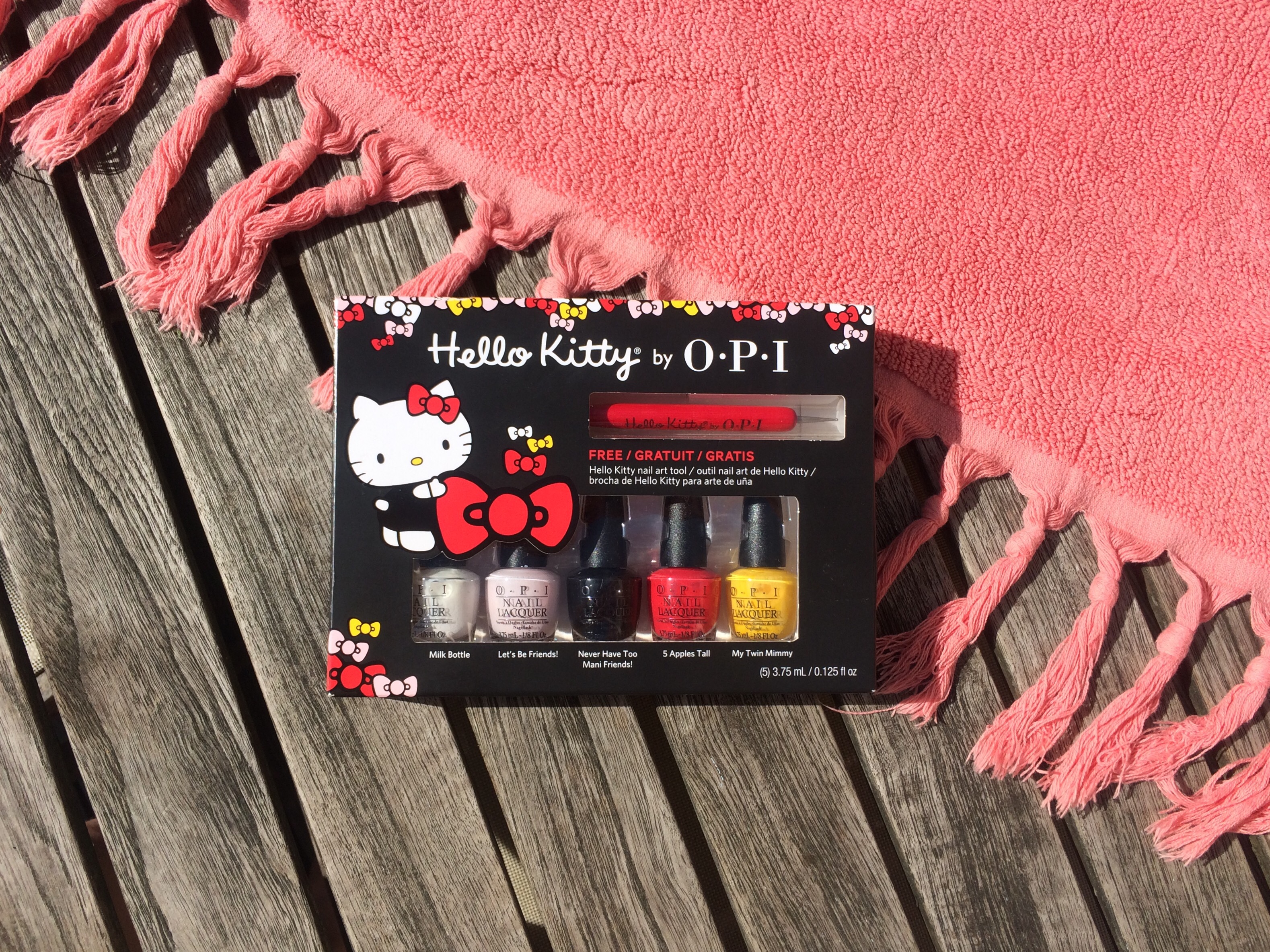 En tant que grande fan d’Hello Kitty, ça faisait un petit moment que je reluquais ce kit de vernis et je l’ai donc acheté en soldes. Hélas seule la boîte est brandée Hello Kitty, mais les couleurs sont vraiment cool : un rouge, un blanc, un rose pale, un noir et un jaune. Par contre niveau application/qualité je ne suis pas archi convaincue, surtout pour du OPI…