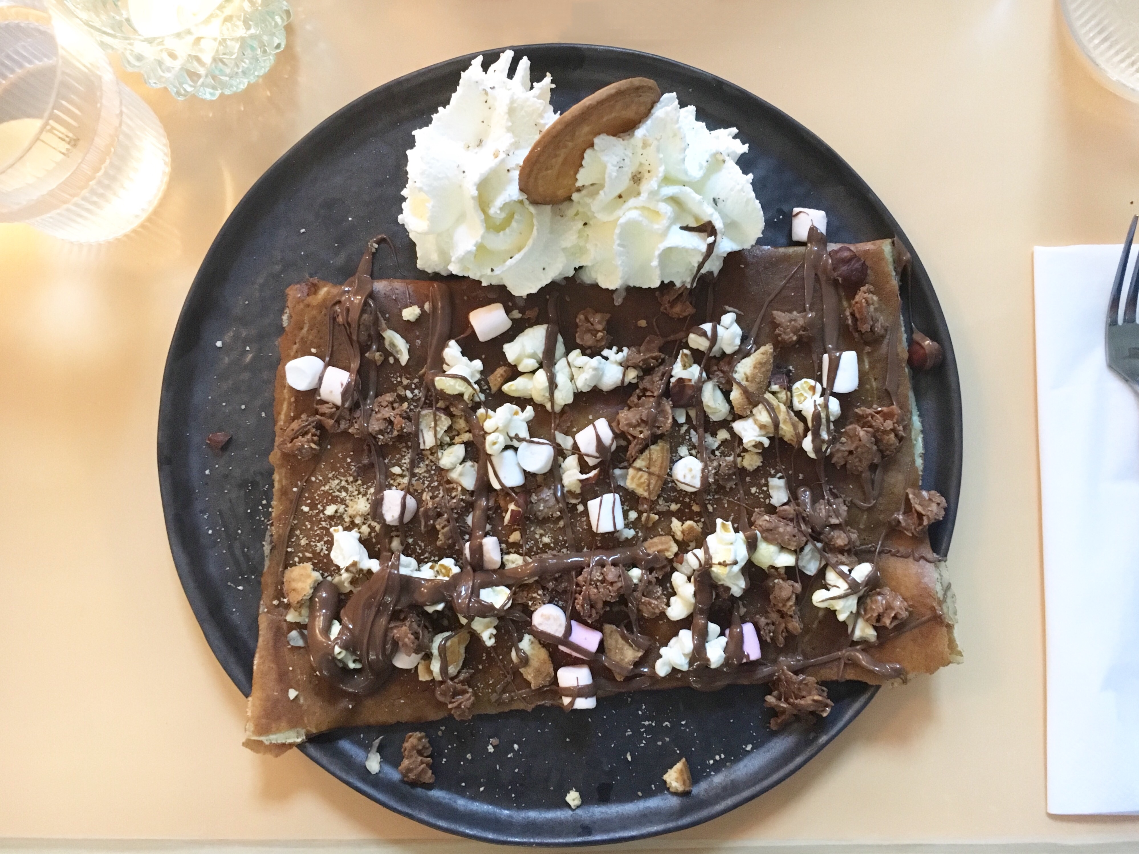Lors de mon dîner j’ai eu l’occasion de goûter à deux crêpes salées (Kiss de NYC et Bella Ragazza) et deux crêpes sucrées (Freak Crepe et Cookie’n’Crime). Autant vous le dire : les galettes de sarrasin salées ont des goûts tellement originaux pour des crêpes, qu’on a du mal à faire son choix. Verdict : elles sont délicieuses. Seul « ombre » au tableau, le petit mesclun de salade qui les accompagne n’est pas assaisonné (#passionbalsamique). Quant aux crêpes sucrées de Bisou, elles sont tellement copieuses et gourmandes que vous n’arriverez probablement jamais à en venir à bout. Non mais regardez tout ce qu’il y a dessus : Nutella, mini marshmallows, sablés breton, chantilly, pop corn, rose des sables… Franchement, devant ça, on se croirait au paradis.