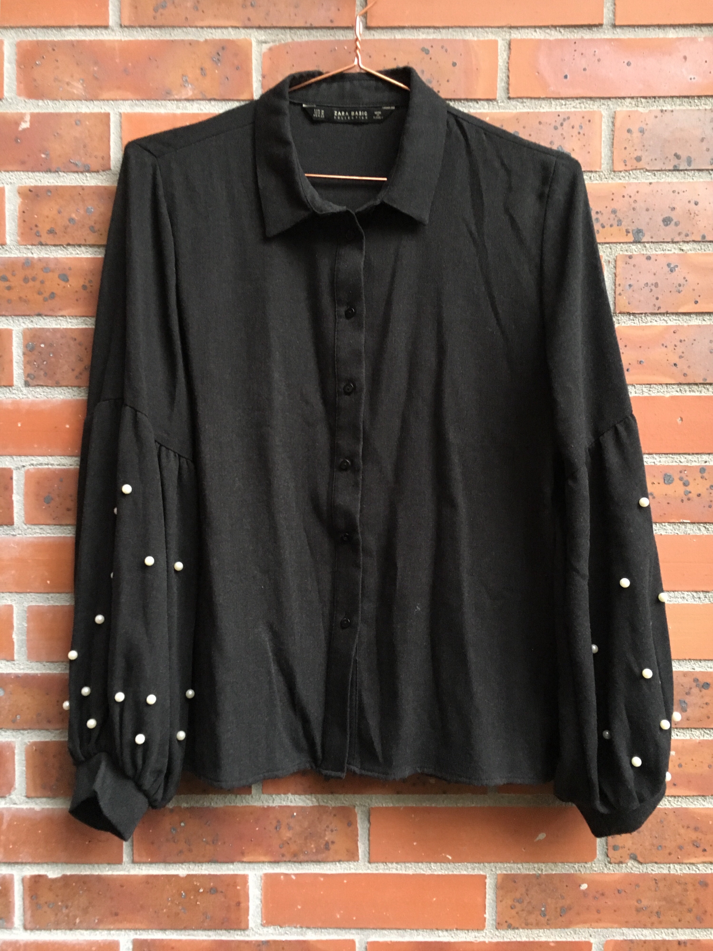 Chemise gris foncé à manches bouffantes perlées ZARA, 24€ au lieu de 29,90€ (-20%)