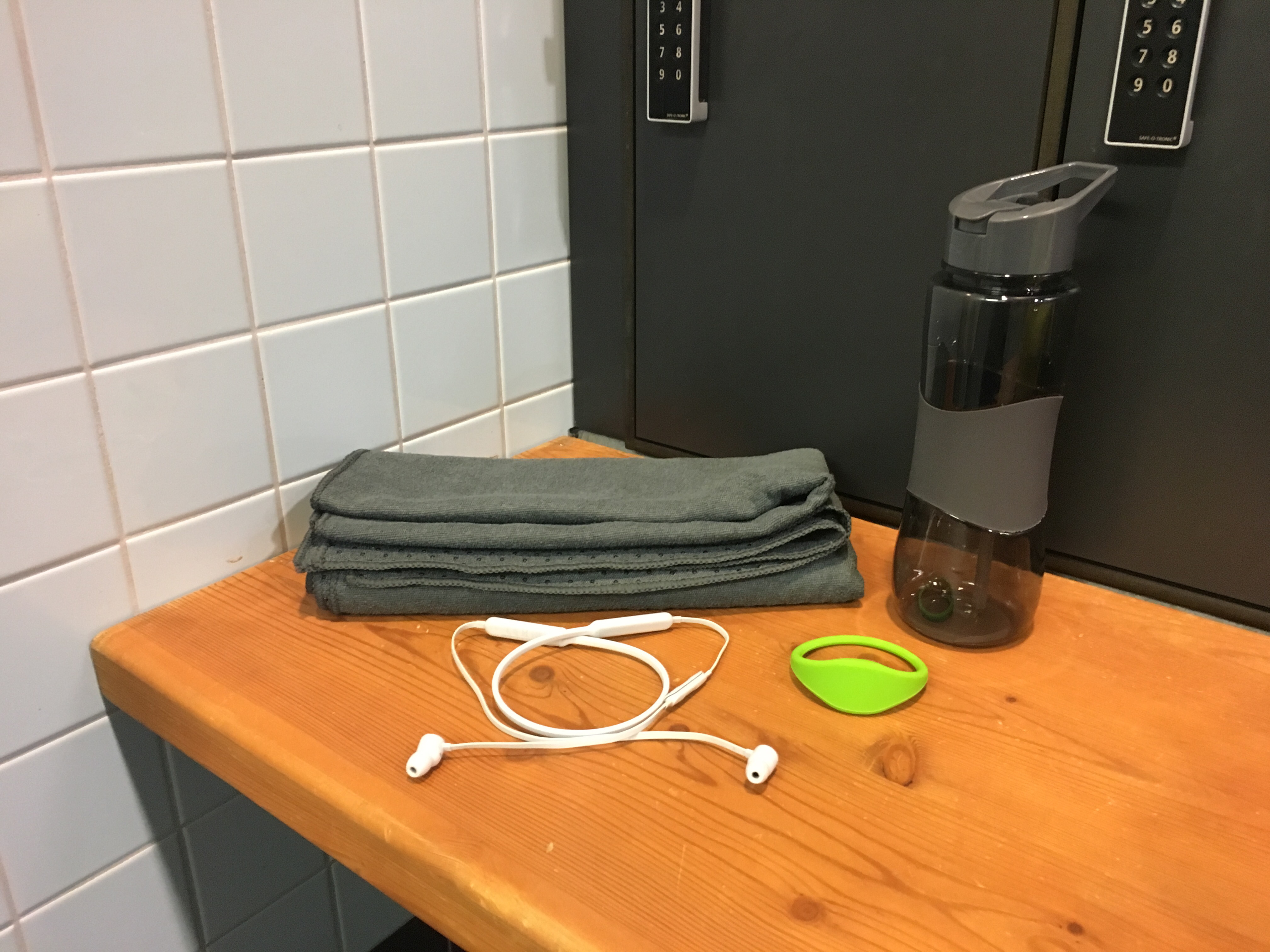 – une gourde avec une bonne capacité, une petite poignée et un pourtour en silicone pour une meilleure tenue. Elle est super car elle est est dotée une paille, donc on ne peut pas perdre le bouchon et on n’a pas à pencher la tête en arrière lorsqu’on est sur les machines.