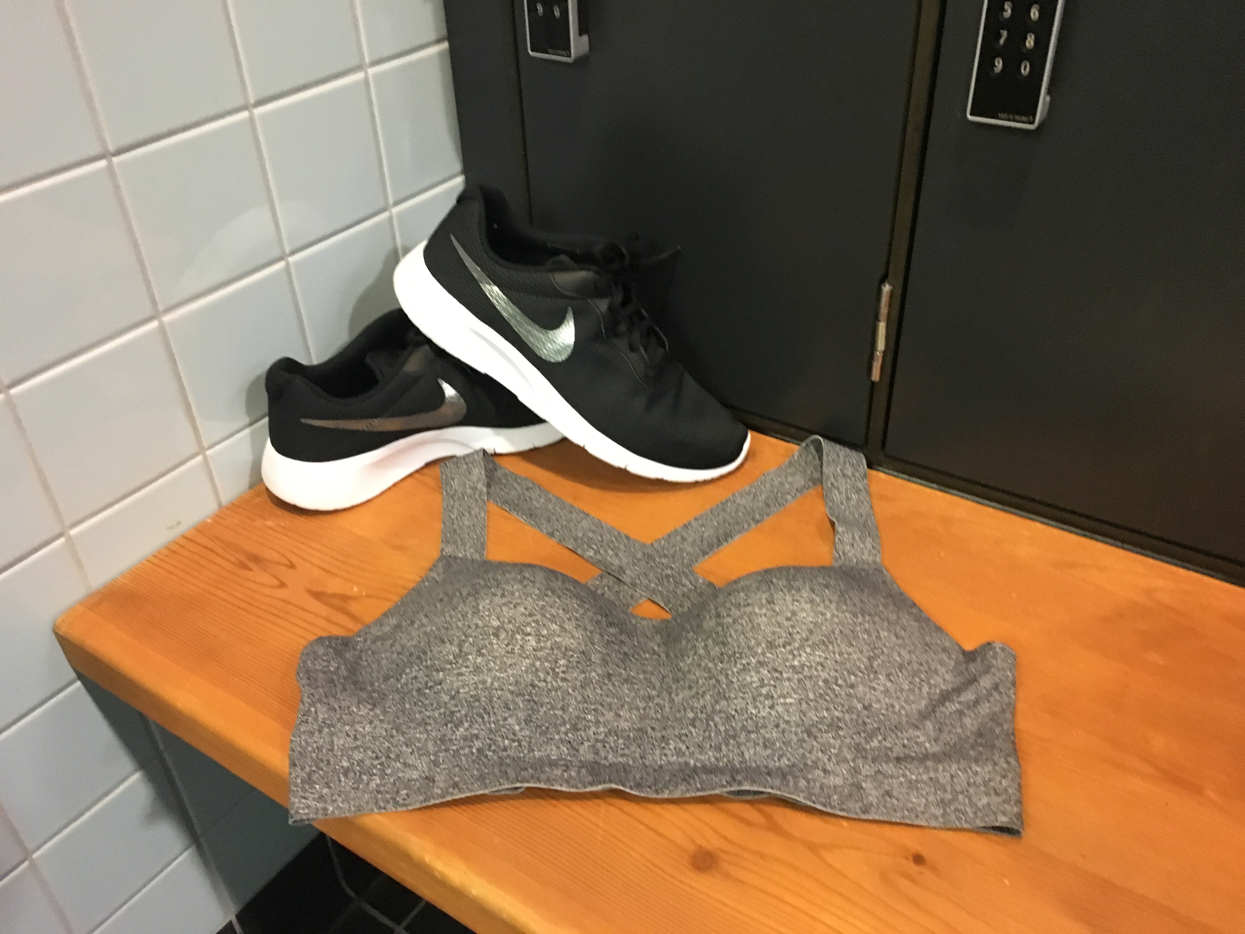 Je ne vous ai pas montré de tee-shirt car je prends n’importe quel top dans la pile et j’en change à chaque cours car c’est le vêtement le plus en contact avec la transpiration.