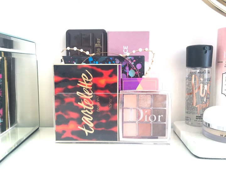 J’ai changé mon rangement pour palette Maisons du Monde en métal cuivré car il ne me permettait pas de ranger deux palettes l’une derrière et qu’il manquait un peu de stabilité. Celui ci est entièrement en plexiglas donc vraiment très discret et vous voyez que dans les 3 compartiments j’arrive à mettre 5 grosses palettes, 2 petites et mon serre tête.