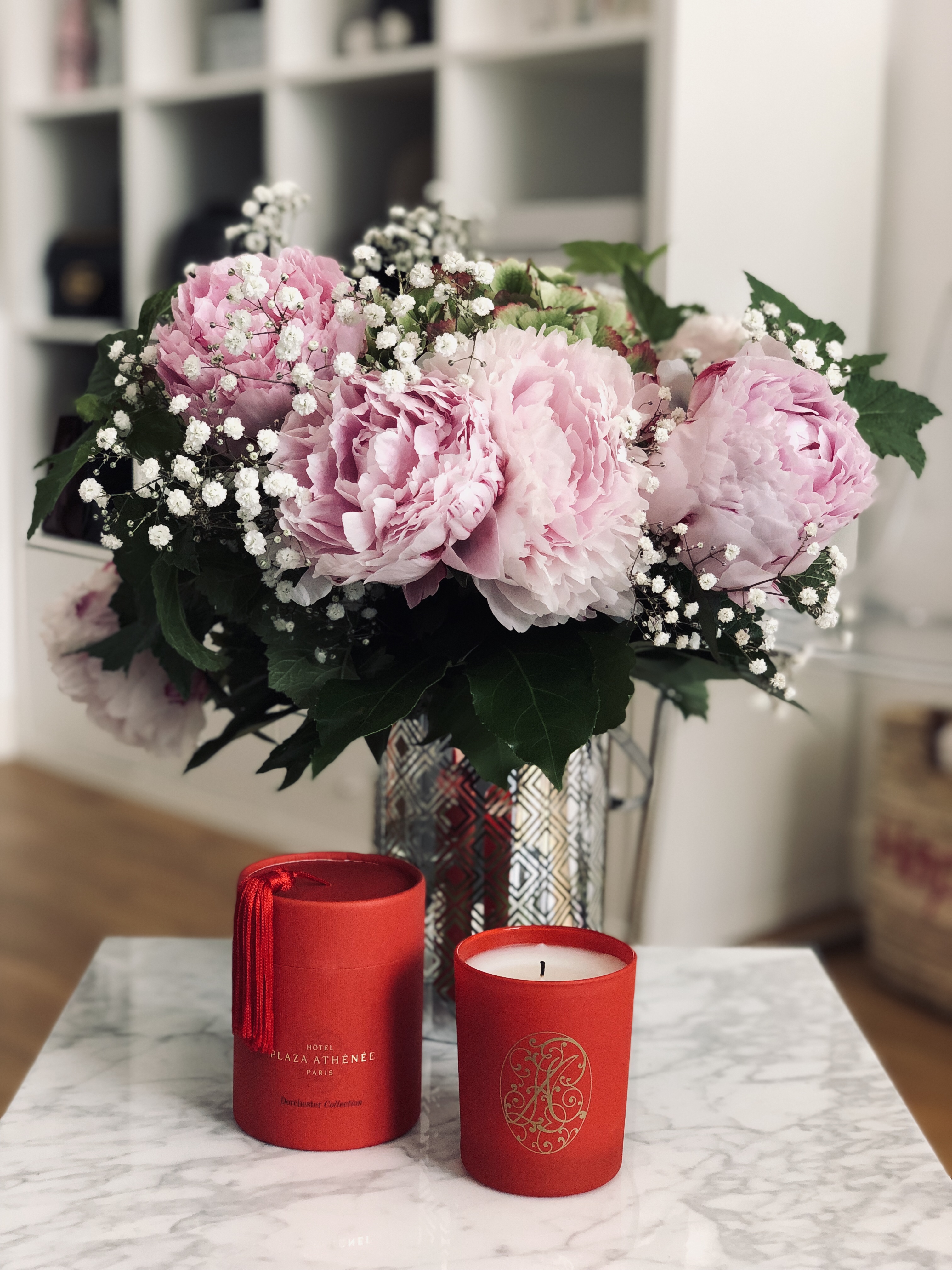 Bougie parfumée du Plaza Athénée + bouquet de pivoines