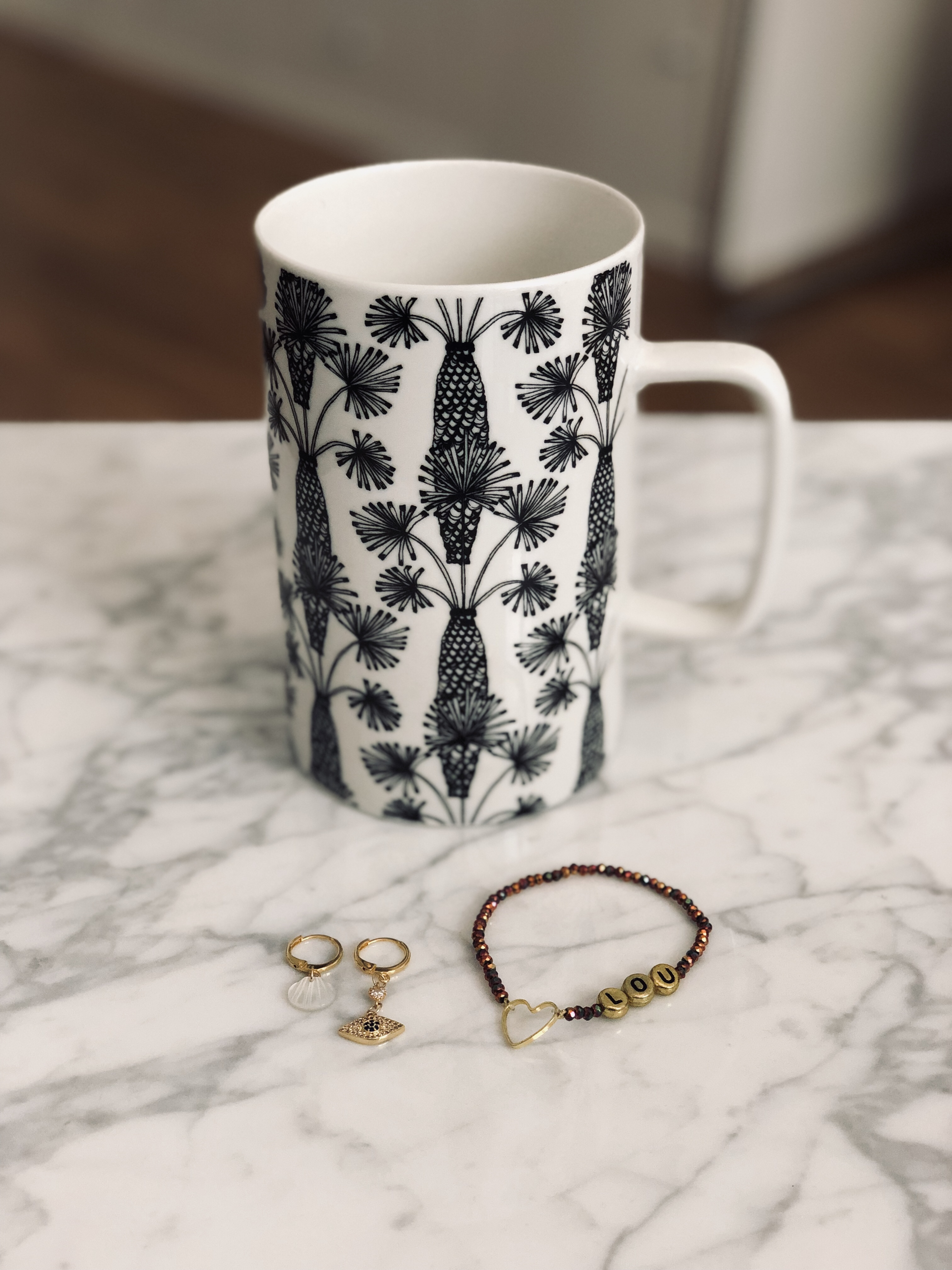 Harmony (ma copine prof de sport, pour ceux qui me suivent sur IG) m’a offert ce grand mug noir et blanc Monoprix. Mais ce que j’ai surtout apprécié, c’est qu’elle réalise des bijoux et qu’elle m’a proposé d’en composer exactement selon mes goûts. J’ai donc choisi ce bracelet avec un coeur et ‘LOU’ (lettres manquantes pour le ‘ISE’ ahah) et ces boucles d’oreilles dépareillées qui s’associeront parfaitement à celles que j’ai déjà et que j’adore.