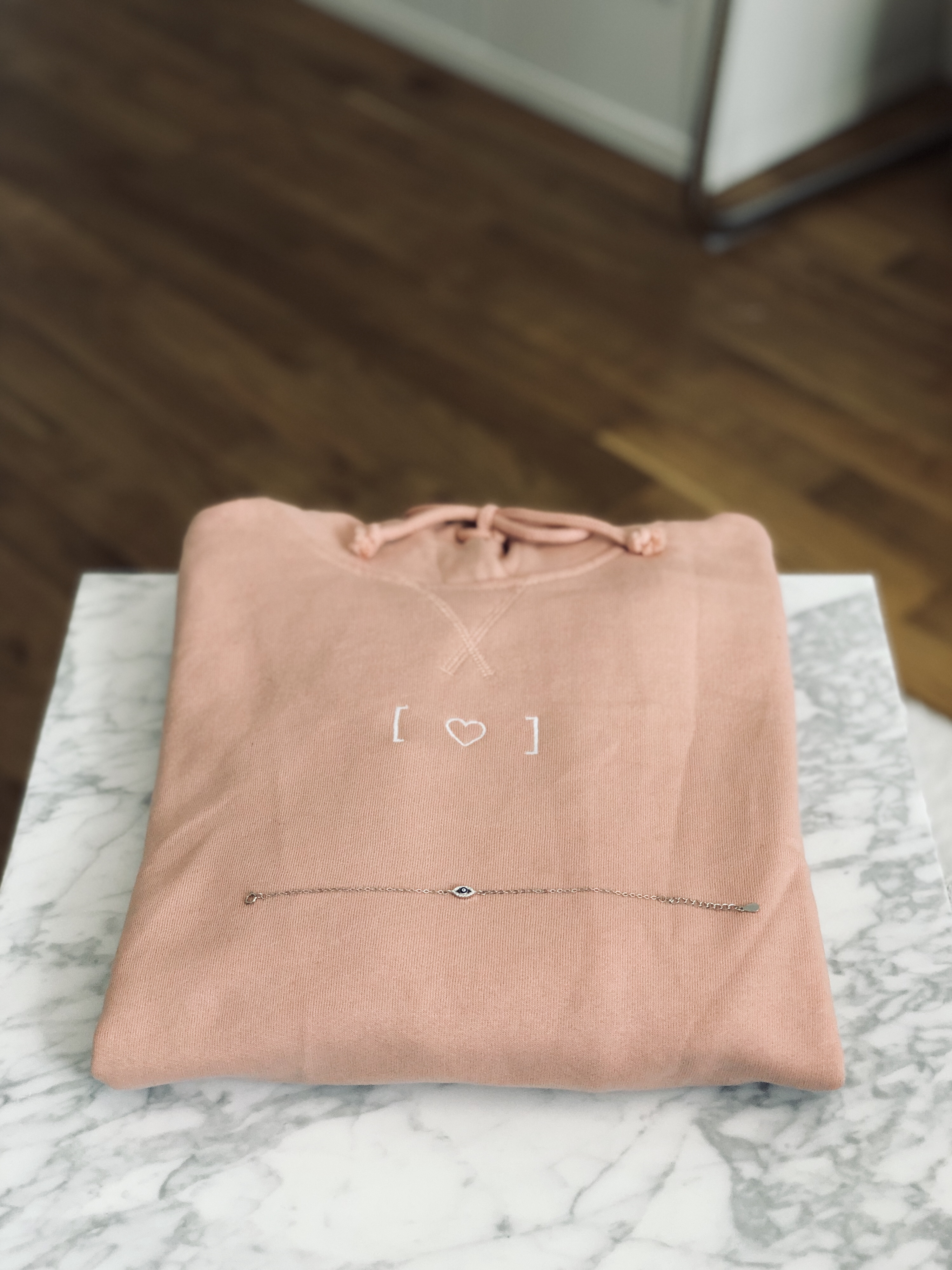 Ma vieille amie Valentine (on se connaît depuis plus de 20 ans) m’a ramené ce très joli bracelet en argent de ses vacances en Grèce : un oeil de protection orné de petits zircons. J’adore les bijoux evil eye ! Elle m’a aussi offert ce sweat à capuche rose pâle Undiz vraiment très cool avec son petit coeur blanc sur l’avant.
