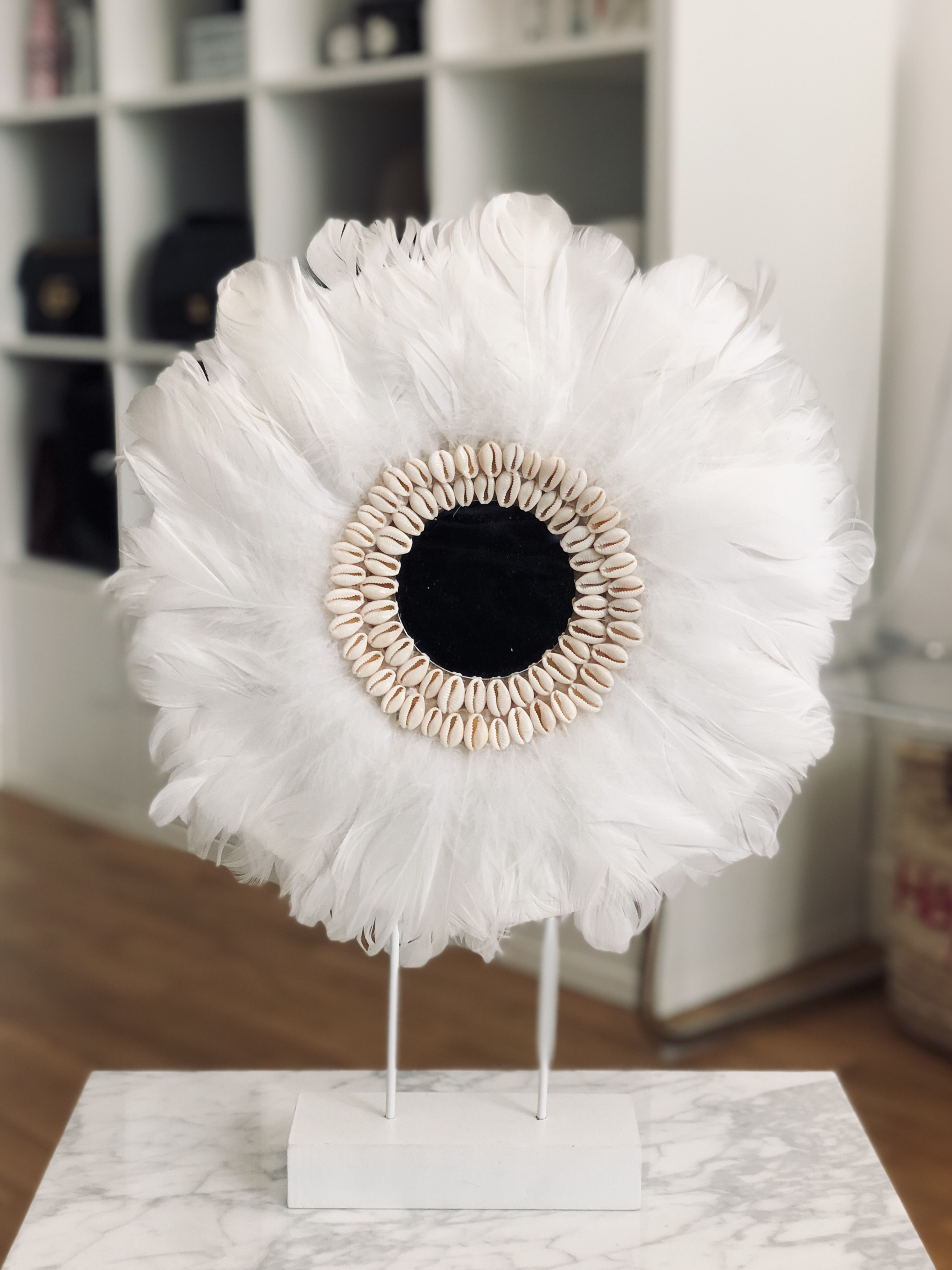 Ma soeur m’ayant demandé de lui donner une idée de cadeau, je lui ai soufflé celle-ci. C’est une décoration qui vient de chez Maisons du Monde : un petit miroir sur pied, orné de coquillages et de plumes blanche. C’est discret et très joli, dans un style un peu bohème chic. Je suis très contente de l’avoir, ça renouvelle un peu ma décoration d’intérieur !