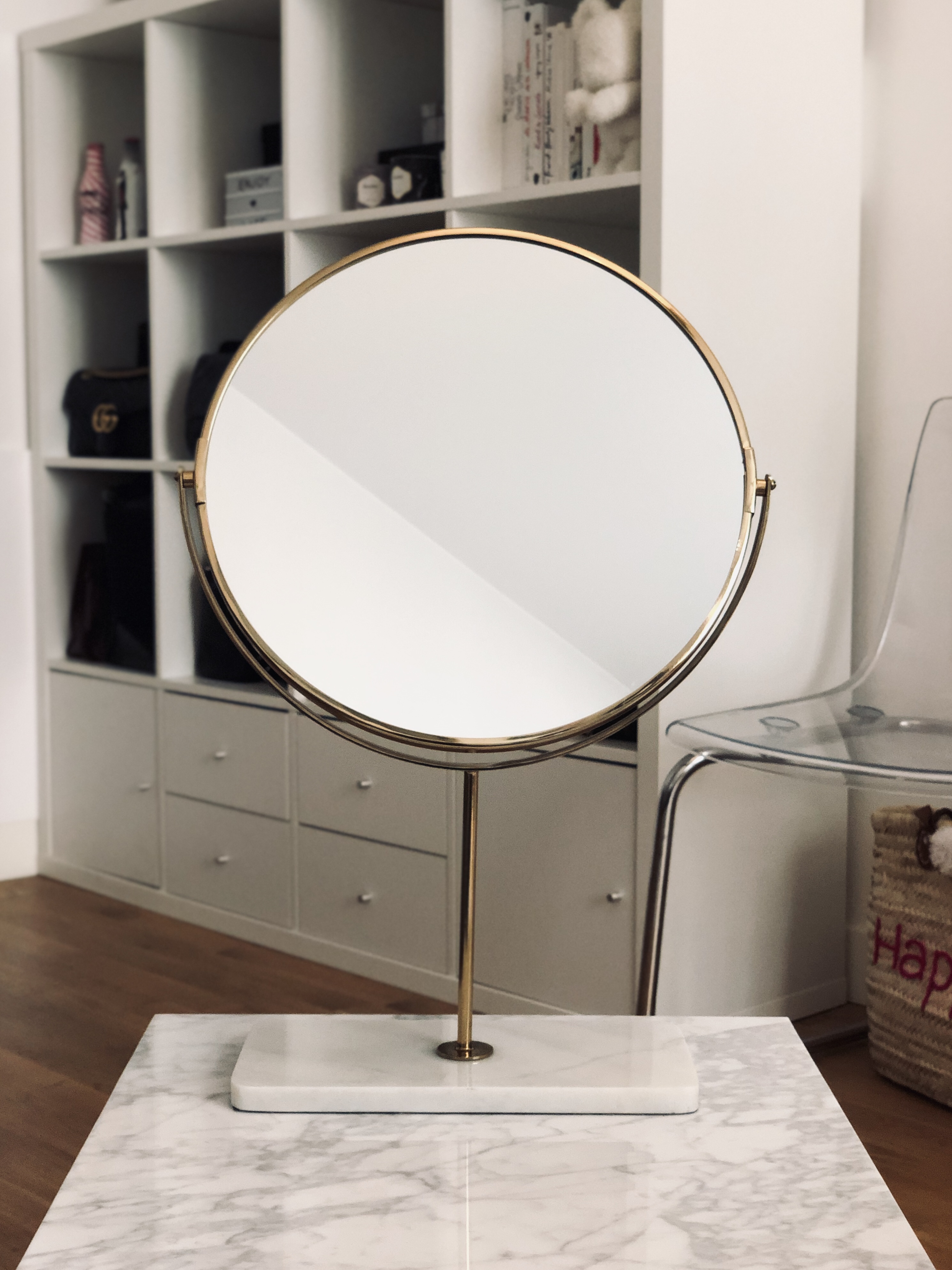 A mon oncle et ma tante j’ai demandé ce miroir Zara Home pour lequel j’ai eu un énorme coup de coeur. Il est en métal doré vieilli et le pied est en marbre véritable. Le miroir est immense et surtout inclinable (parfait pour gérer la luminosité). Bref, il est magnifique et il a bien trouvé sa place sur ma coiffeuse.