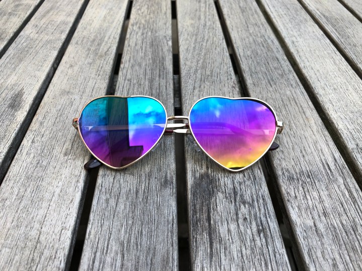 J’ai une soirée Coachella dans 10 jours, c’était donc l’excuse parfaite pour acheter ces lunettes de soleil beaucoup trop cool avec leur forme de coeur et leurs verres aux couleurs de l’arc en ciel. Ce sont des catégories 3 donc j’espère qu’elles protégeront quand même un peu des UV !