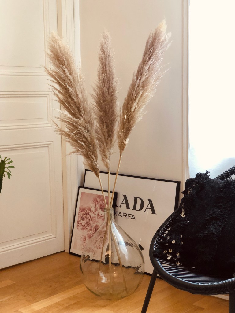 Nouvel élément dans ma décoration, l’incontournable et très tendance duo Dame Jeanne + Pampa. J’ai acheté ces immenses pampa très fournies à ma fleuriste pour seulement 4€ (un super prix !). Et j’ai ensuite cherché pendant plusieurs jours sur Leboncoin LA Dame Jeanne idéale – pas trop petite, ni immense, en verre incolore, propre et à un prix correct – et je l’ai trouvée hier. Je suis très fan de ce combo que j’ai pour l’instant installé vers ma porte d’entrée.