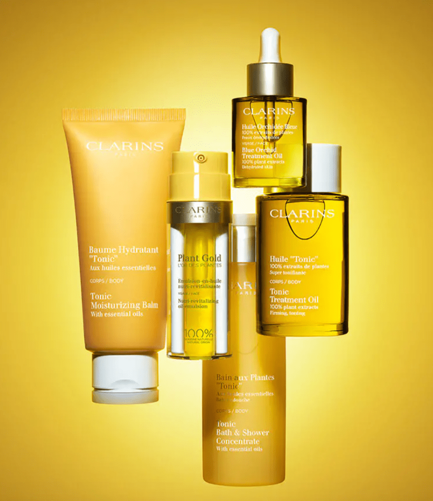 Clarins est une marque que j’apprécie beaucoup, en soin comme en maquillage, et j’ai régulièrement l’occasion de tester leurs nouveautés, ce qui n’est pas pour me déplaire. J’ai récemment reçu la totalité de la gamme Aromaphytosoin, que je vous présente ce jour. Le concept a été créé par Jacques Courtin-Clarins il y a plus de 60 ans : la synergie d’huiles essentielles aromatiques et d’extraits de plantes bienfaisantes au cœur de 6 huiles. « Aroma » pour le pouvoir olfactif et stimulant des huiles essentielles. En effet, c’est ce que sent l’intégralité de ces produits Clarins, tout en gardant une grande sensorialité (on ne tombe pas dans le too much des huiles essentielles qui peut être désagréable selon moi). « Phyto » pour les vertus bienfaisantes des extraits de plantes : de l’amande nourrissante, du citron drainant, de l’aloe vera hydratante, du karité nourrissant, du lotus astringeant… Et « soin » puisque ces produits sont 100% bien-être mais ne négligent pas l’efficacité. On commence cette routine Clarins avec le Bain aux Plantes « Tonic », un soin nettoyant en texture gel (pour tous types de peaux) qui s’active sous l’effet de la chaleur de l’eau et sent le romarin, la menthe et le géranium. Suit ensuite le Gommage « Tonic » Corps, pour affiner le grain de peau et activer le renouvellement cellulaire. Côté huiles, on retrouve le romarin, la menthe mais aussi le bois de rose, associées à des cristaux de sucre et sel, qui rendent le gommage efficace, non abrasif (respect du film hydrolipidique grâce à l’huile de noisette et le beurre de karité) et très agréable. Puis on ne lésine pas sur l’hydratation avec 2 options, un baume hydratant « Tonic » ou une Huile super tonifiante, 100% aux extraits de plantes. Pas forcément le type d’odeur que je préfère pour l’hydratation corporelle, mais ça reste très vivifiant. Et je préfère personnellement le baume, qui pénètre plus vite, à la texture huile. Clarins a aussi signé un soin visage dans cette gamme Aromaphysotoin : Plant Gold, une émulsion-en-huile nutrirevitalisante, qui a gagné le Prix d’Excellence Marie Claire l’an dernier. Ce flacon double renferme l’iconique huile d’Orchidée bleue Clarins et une émulsion légère, non grasse, adaptée à tous types de peau. Le produit s’utilise matin et/ou soir, en lieu et place de votre crème hydratante. Je n’ai pas encore d’avis à vous donner sur ce produit car j’attends d’avoir fini ma crème actuelle pour le tester pendant plusieurs semaines afin que mon avis soit tout à fait objectif sur ses effets. Mais je vous tiens bien évidemment informées !