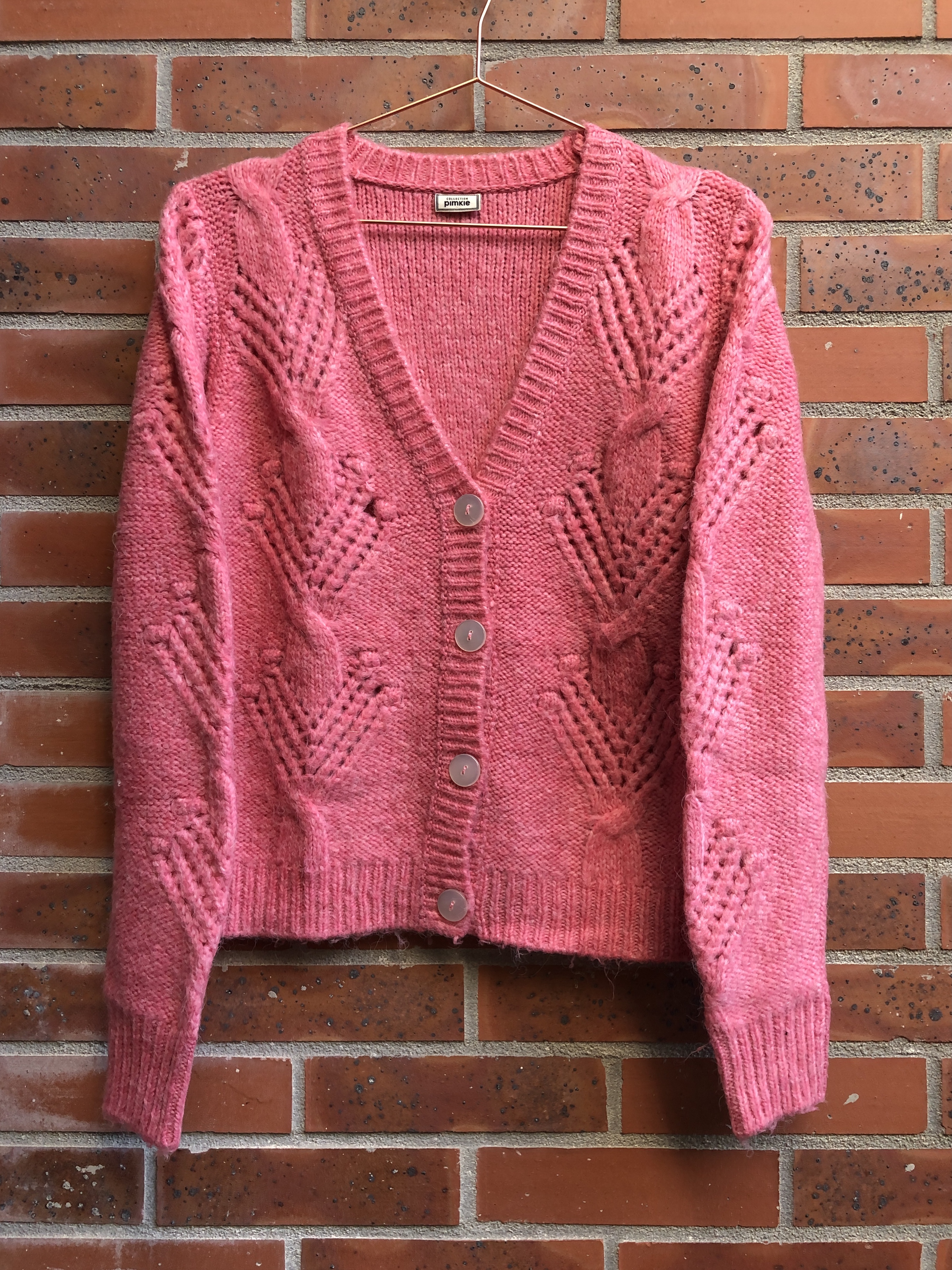 J’avais très envie de cardigans cet hiver, à porter à même la peau ou par-desssus un petit caraco en soie et dentelle, et j’ai trouvé mon bonheur chez Pimkie. J’ai d’abord acheté le vert menthe et j’ai été ravie de mon achat, il ne gratte absolument pas, les boutons sont un peu nacrés et il y a un effet ajouré très joli. Du coup j’ai aussi opté pour le modèle rose, tout aussi canon.