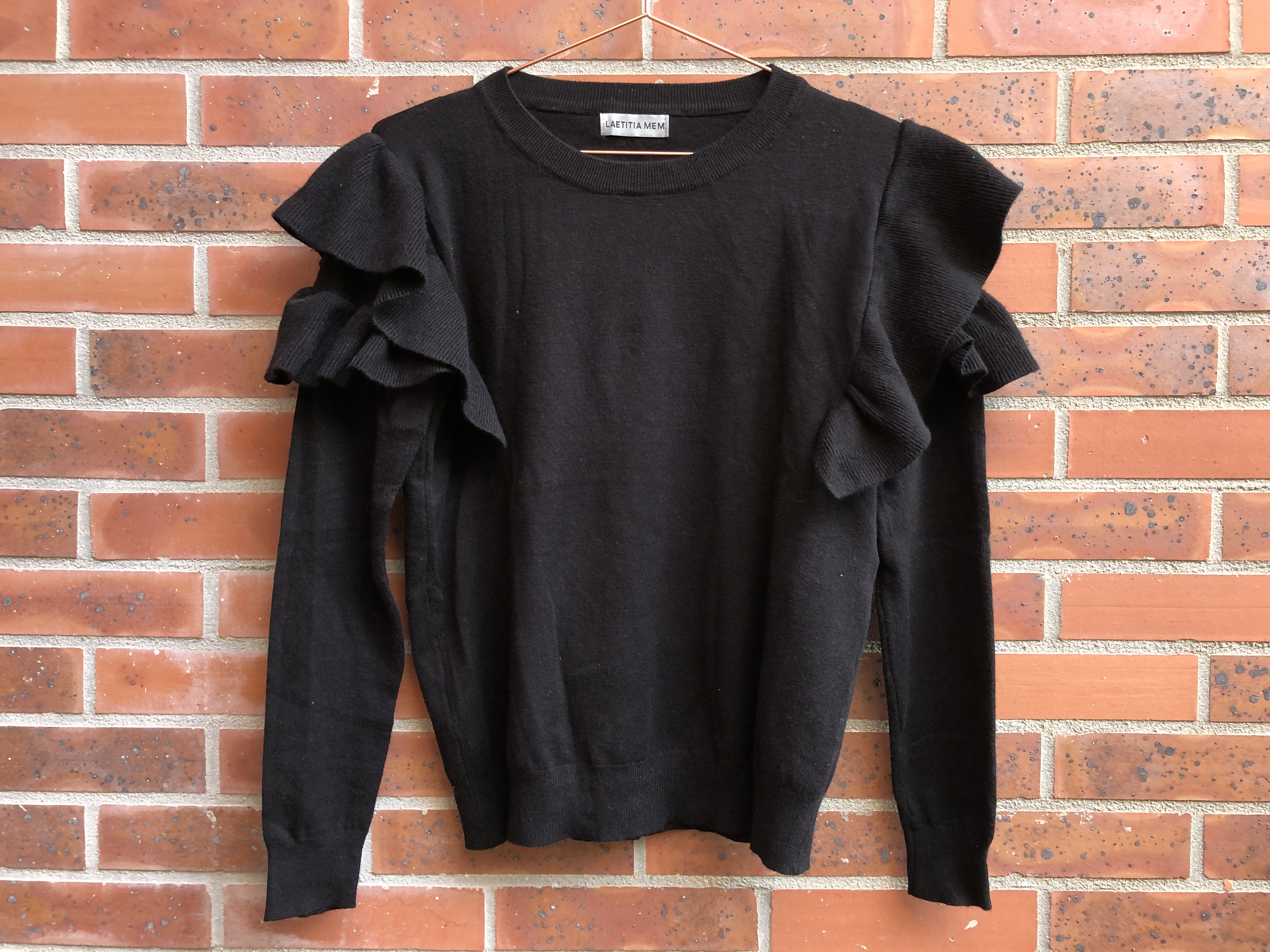 Pull à volants noir, 5€ – Jupe pied de poule, 18€