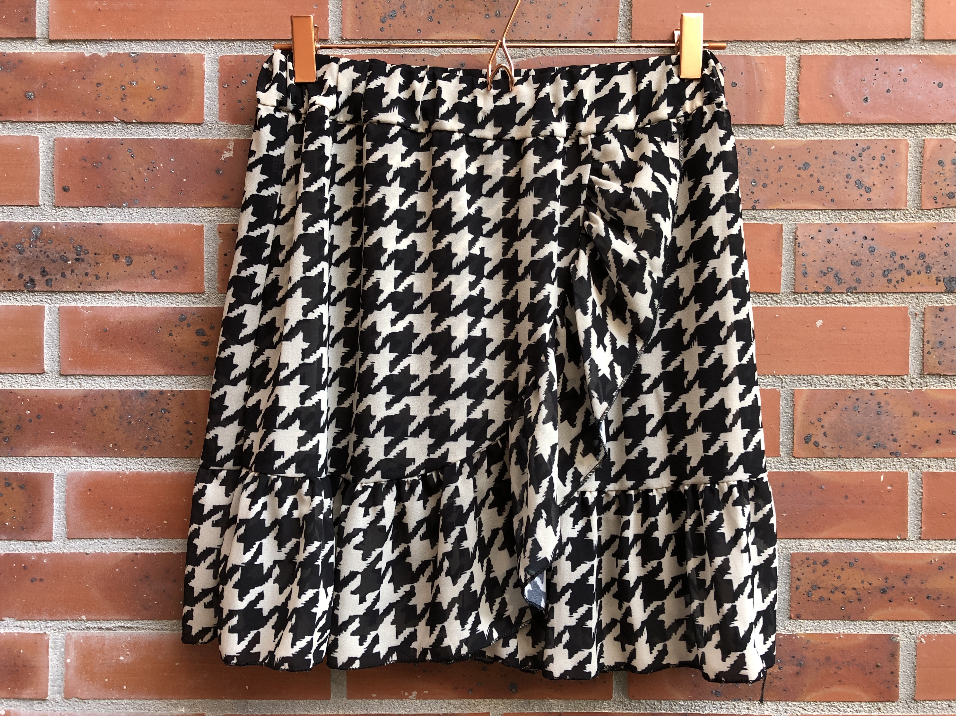 Il y a 2 semaines, une amie m’a emmenée à Saint Denis faire la tournée des magasins « chinois » et je vais donc vous présenter les 4 articles que j’y ai acheté. Pour commencer, un petit pull noir en maille avec des volants au niveau des épaules. Une variante au petit pull basique noir, que j’ai eu en promo à 5€. J’avais aussi envie d’une nouvelle jupe et ça tombe bien car j’ai trouvé celle-ci. Elle est en voile imprimé pied de poule écru/noir, avec un effet portefeuille (mais il y a bien une doublure noire dessous) et des volants à l’avant.