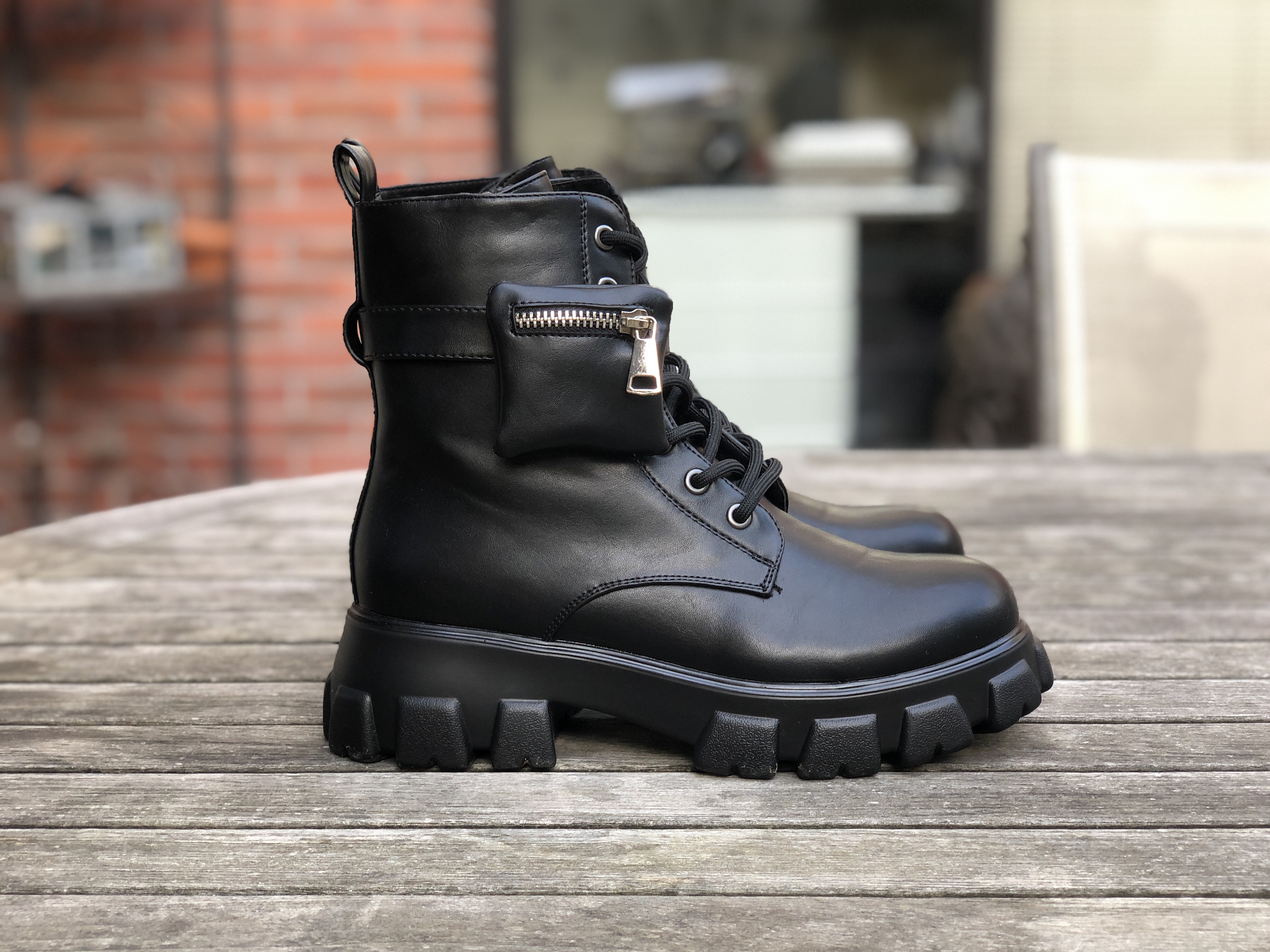 Deuxième indispensable de la saison A/H, des combat boots inspiration Prada. Chez les chinois, il y en a pour tous les goûts : des basses, montantes, en simili lisse ou effet croco… Mais j’ai opté pour le modèle le plus basique puisqu’elles sont déjà assez imposantes comme ça (d’ailleurs j’enlève les petites pochettes lorsque je les portecar je ne les trouve pas vraiment utiles).