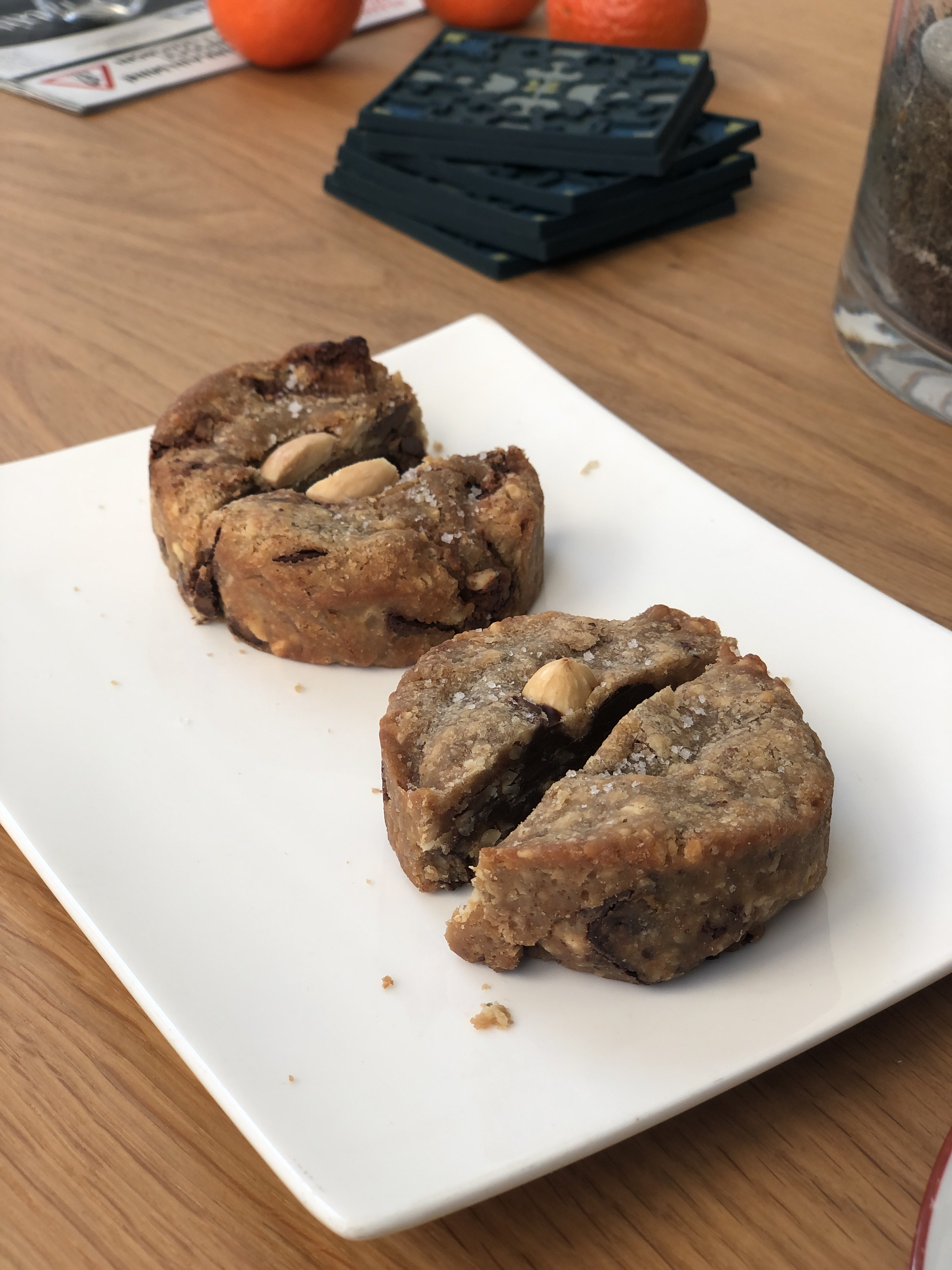 Je me suis rappelée que j’avais entendu parler de ce chocolatier à Boulogne, qui faisait a priori de sacrés cookies. Vous connaissez mon amour pour cette douceur, donc ni une, ni deux, je suis allée en juger moi-même. Qu’on soit clairs : ils font définitivement partie de mon top 3 cookies ! Ils sont croustillants et moelleux comme on aime et surtout très très bien garnis. Impossible de les départager entre le chocolat noir/amande et le chocolat au lait/noisette (il existe aussi un 3ème parfum je crois), prenez-les deux.