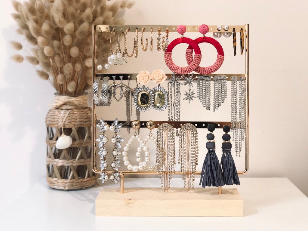 Ayant une belle collection de grosses boucles d’oreilles (comme vous pouvez le voir sur la photo), je voulais trouver le présentoir qui me permette de toutes les voir d’un coup, sinon j’oublie de les porter et c’est bien dommage. J’ai commandé celui-ci sur AliExpress (je le voulais en noir initialement mais out of stock dans cette taille) et il est vraiment parfait : stable, élégant, très qualitatif et la hauteur entre les rangées me permet même d’y mettre mes plus longues BO.