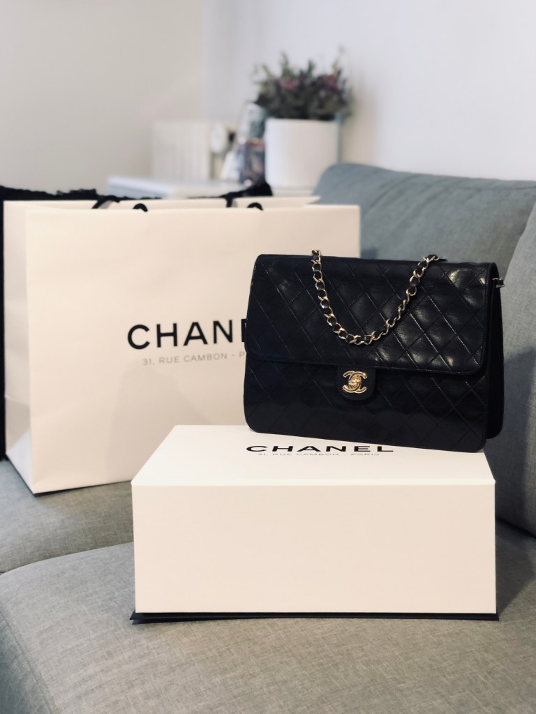 Il y a plusieurs années j’ai eu ce Timeless vintage pour mon anniversaire (j’avais fait une affaire de folie car je l’avais trouvé pour 6 ou 700€ sur Ebay.com) mais je l’ai peu porté car sa bandoulière est assez courte et le système de fermeture faisait tout le temps des siennes. Je l’ai déposé au SAV Chanel fin septembre pour qu’ils me changent le fermoir (ça m’a couté 95€, c’est correct) et je l’ai récupéré début décembre. Ils m’ont mis le même que sur les Timeless actuel, qui est beaucoup plus pratique. Puis j’ai moi-même rajouté une chaine style Chanel plus longue donc maintenant j’ai l’impression d’avoir un tout nouveau sac et je vais pouvoir m’en servir un maximum !