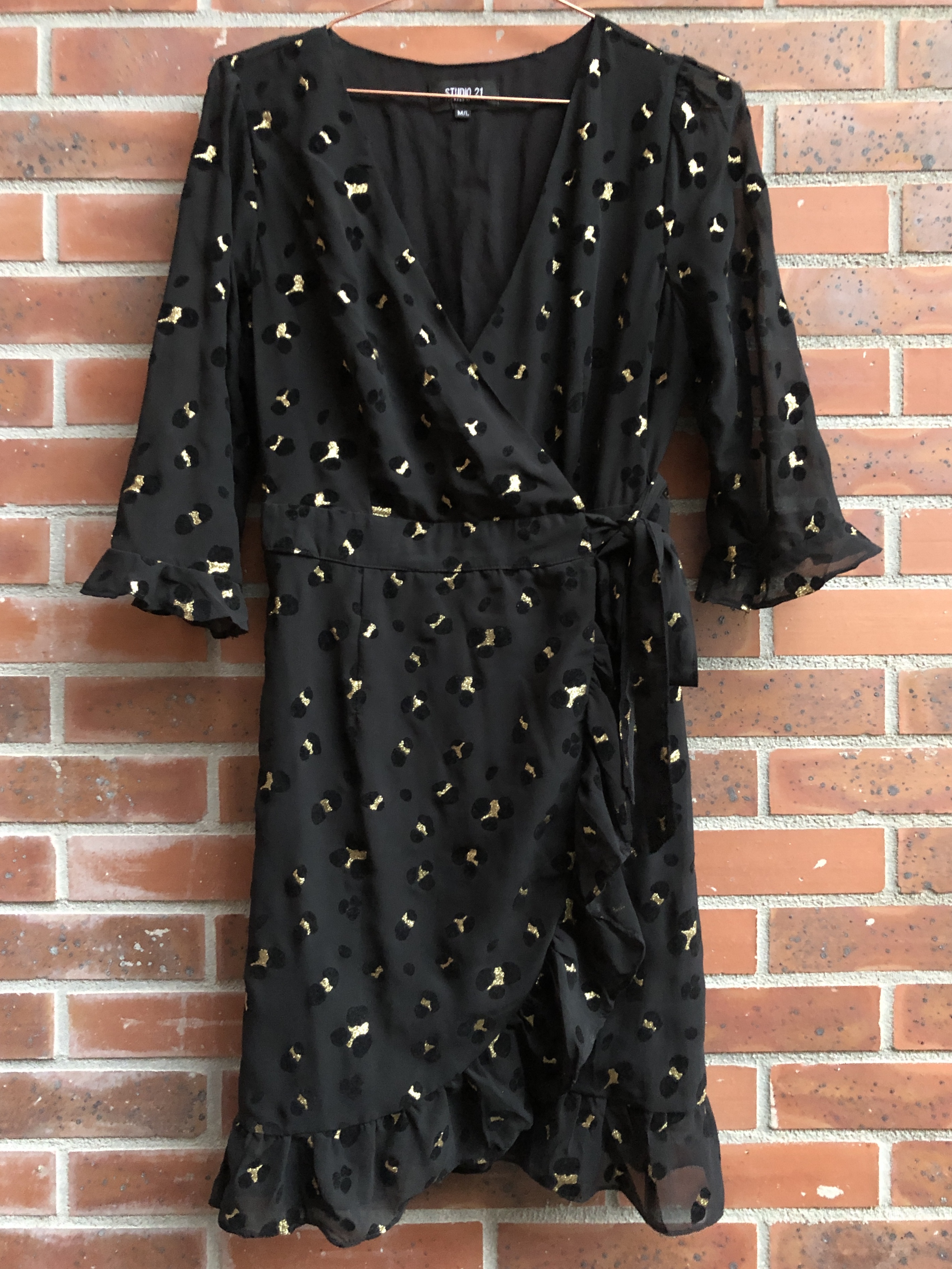C’est une robe que j’ai achetée chez Lola & Co pendant le 2ème confinement, dans l’optique de la porter pendant les fêtes (les autres occasions de sortie étant réduites à néant). C’est une forme cache coeur, qui se noue sur le côté grâce à une ceinture qui marque la taille et il y a des volants sur les extrémités pour ajouter du volume. Mais ce que j’ai préféré, c’est l’imprimé léopard ton sur ton, en velours noir et lurex doré.