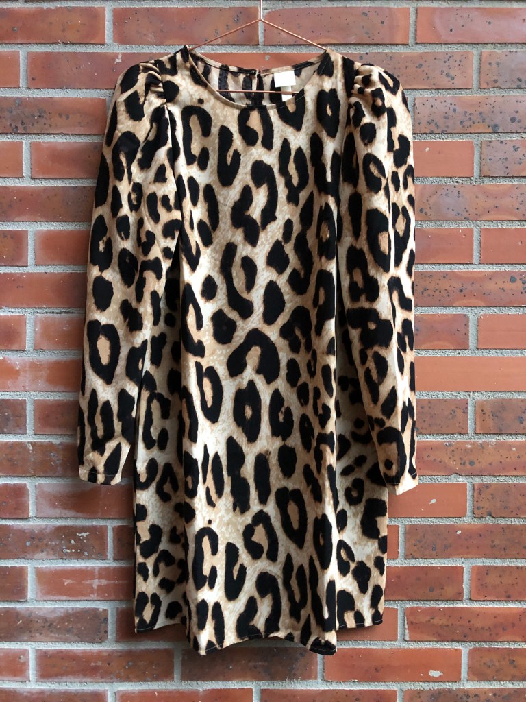 Petite robe très cool shoppée chez H&M lorsqu’ils ont sorti toute une collection avec un imprimé léopard (jupe, top, robe…) dans de jolies matières qui ne font pas vulgaire. Elle n’était déjà pas chère à la base mais elle a en plus été mise en promotion sur le site ! Et franchement cela n’impacte pas du tout la qualité et j’adore la coupe droite avec les épaules bouffantes.