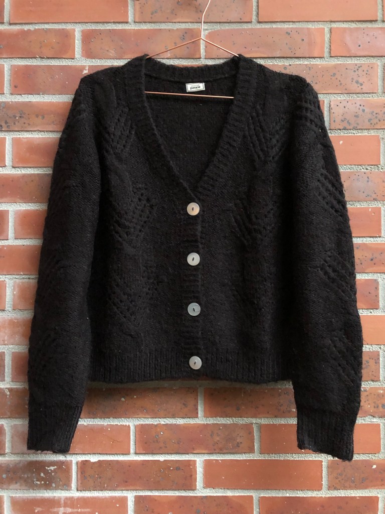 Ce gilet Pimkie, vous l’avez déjà vu en deux coloris dans mon précédent haul mode puisque je le posséde déjà en rose et vert d’eau. J’ai profité des promotions du Black Friday pour le shopper à -30% et en commander un pour ma mère qui le voulait aussi. J’aime beaucoup le modèle en grosse maille ajourée, avec les boutons nacrés (mais je trouve qu’en noir la matière fait un peu moins qualitative). Toutefois, ça reste un bon basique et il est très doux sur la peau.