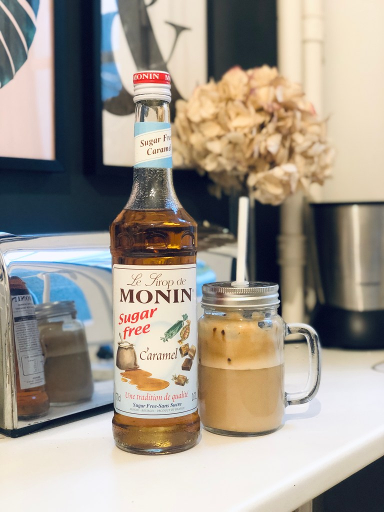 Je ne suis pas une grande fan de café (ou de boissons chaudes en général-, mais je ne dis pourtant jamais non à un iced coffee. Du moment que ça inclut du sucre et du lait, ça me va. Et pour reproduire un ersatz de Frappuccino Starbucks à la maison, j’ai acheté du sirop Monin sans sucre au caramel. Ça parfume et sucre une boisson en même temps. Et c’est aussi délicieux dans un lait tiède. En revanche c’est assez casse-pied de trouver les déclinaisons sugar free, j’ai du aller chez Zodio pour en avoir !