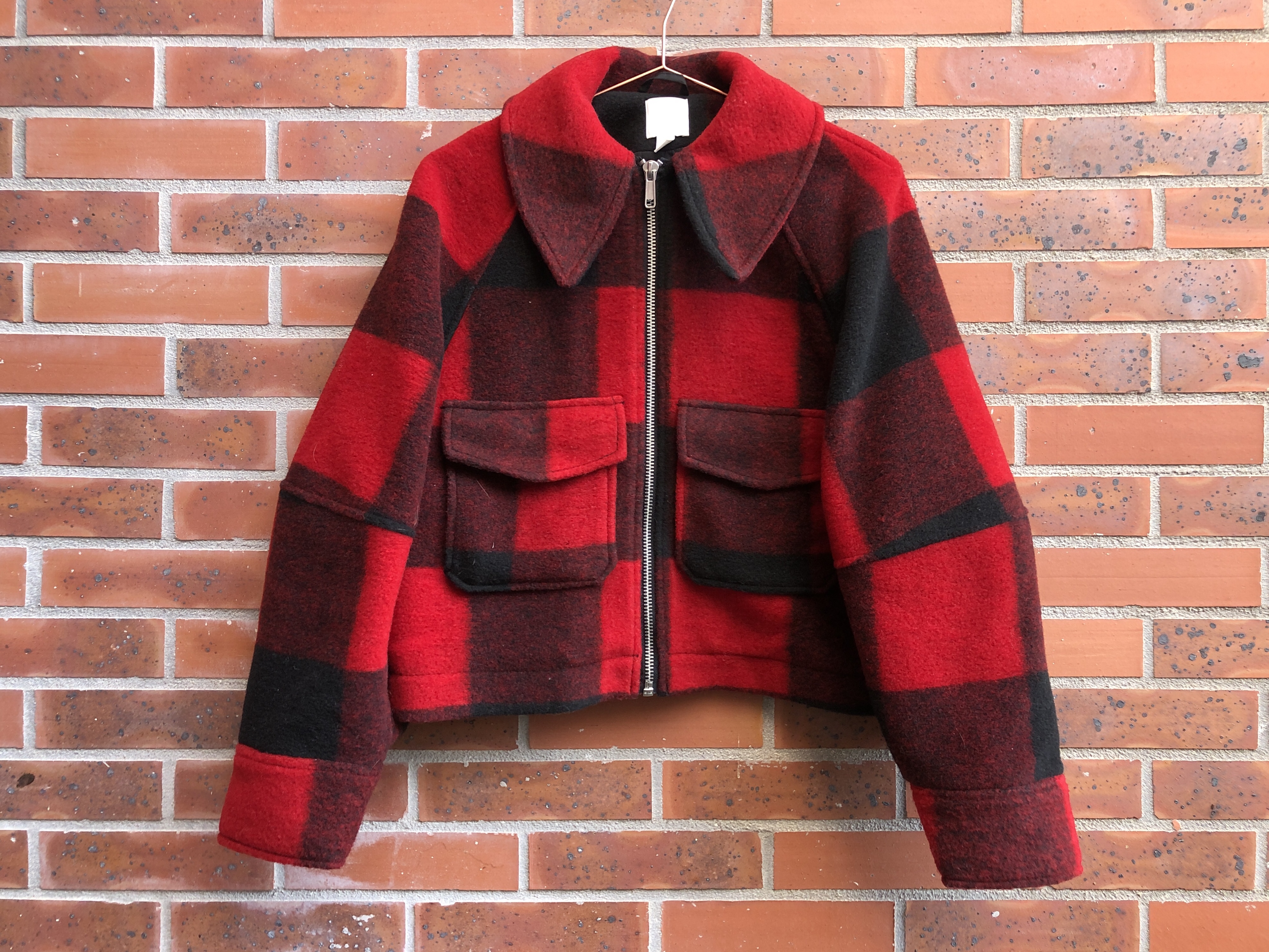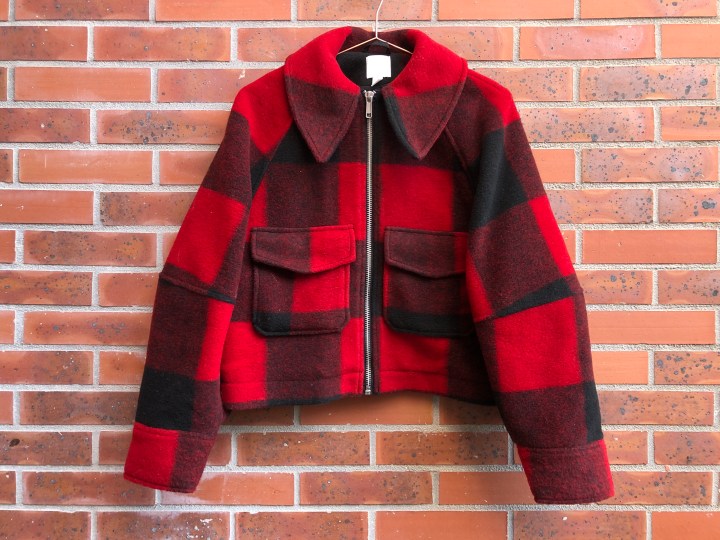 Cette veste courte a de suite attiré mon regard et le prix sur l’étiquette a fini de me convaincre. Elle est en matière feutrée, à gros carreaux noir et rouge, la coupe est très oversize (pourtant j’ai pris XS/S) surtout au niveau des bras mais c’est ce qui la rend si cool.