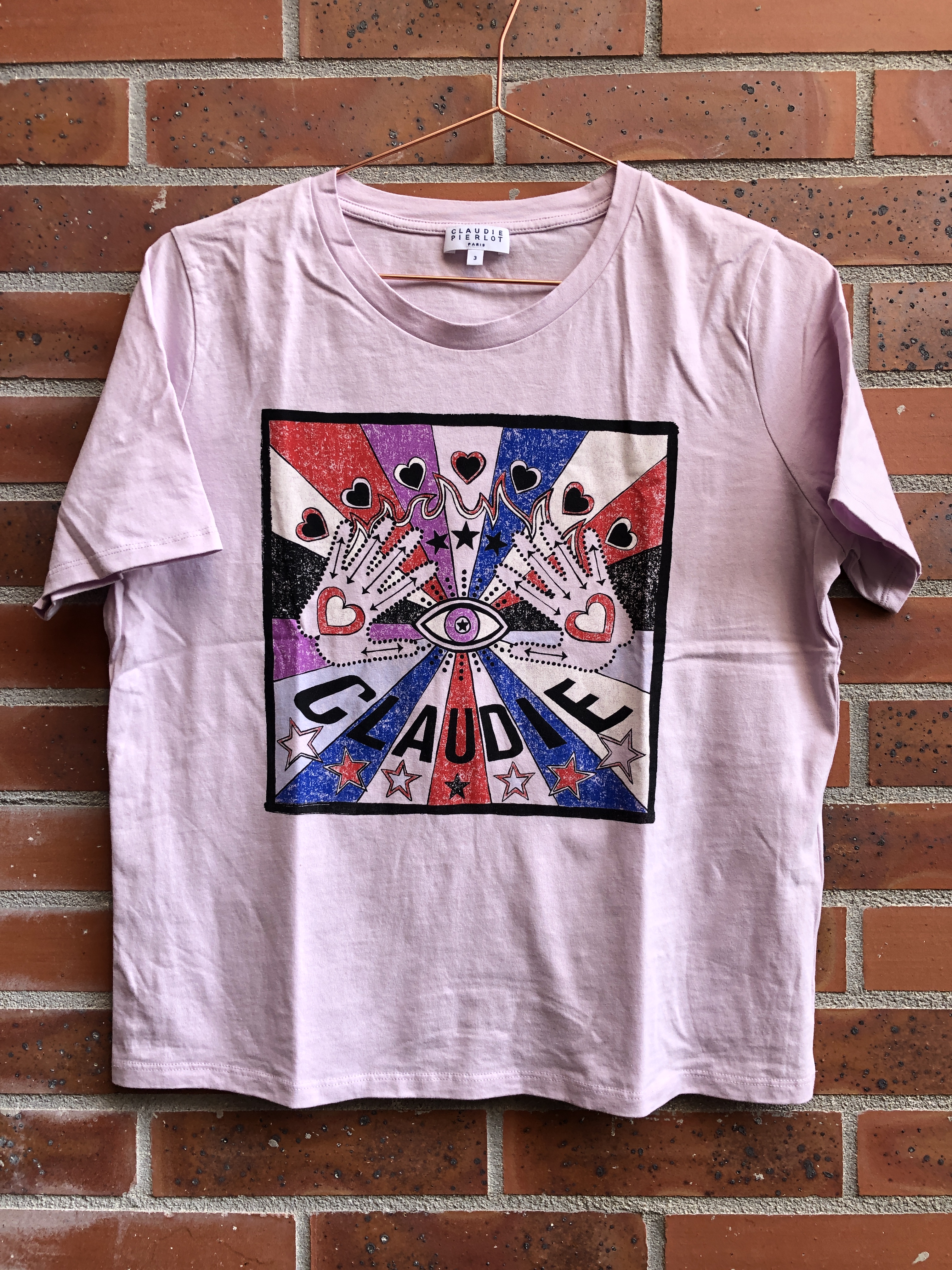 Ce même jour il y avait aussi une vente privilège Claudie Pierlot avec des articles à prix fixe. J’ai craqué sur ce joli tee-shirt lila, avec un motif un peu ésotérique. Il se trouve qu’il était en fait mal rangé et qu’il n’aurait pas du être là (mais dans la boutique outlet, plus cher), tant mieux pour moi ! Et un bon point pour le repassage.