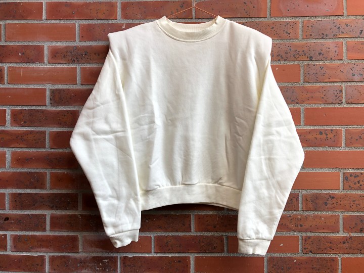 Je vous ai présenté ce même sweat en coloris camel dans mon dernier haul mode. Le voici cette fois en blanc cassé. J’ai adoré ce modèle à prix mini trouvé chez H&M, avec ses épaulettes qui donnent immédiatement du style à un sweat très basique. Indisponible en ligne, donc rendez-vous dans votre magasin le plus proche (et ouvert !) pour le trouver.