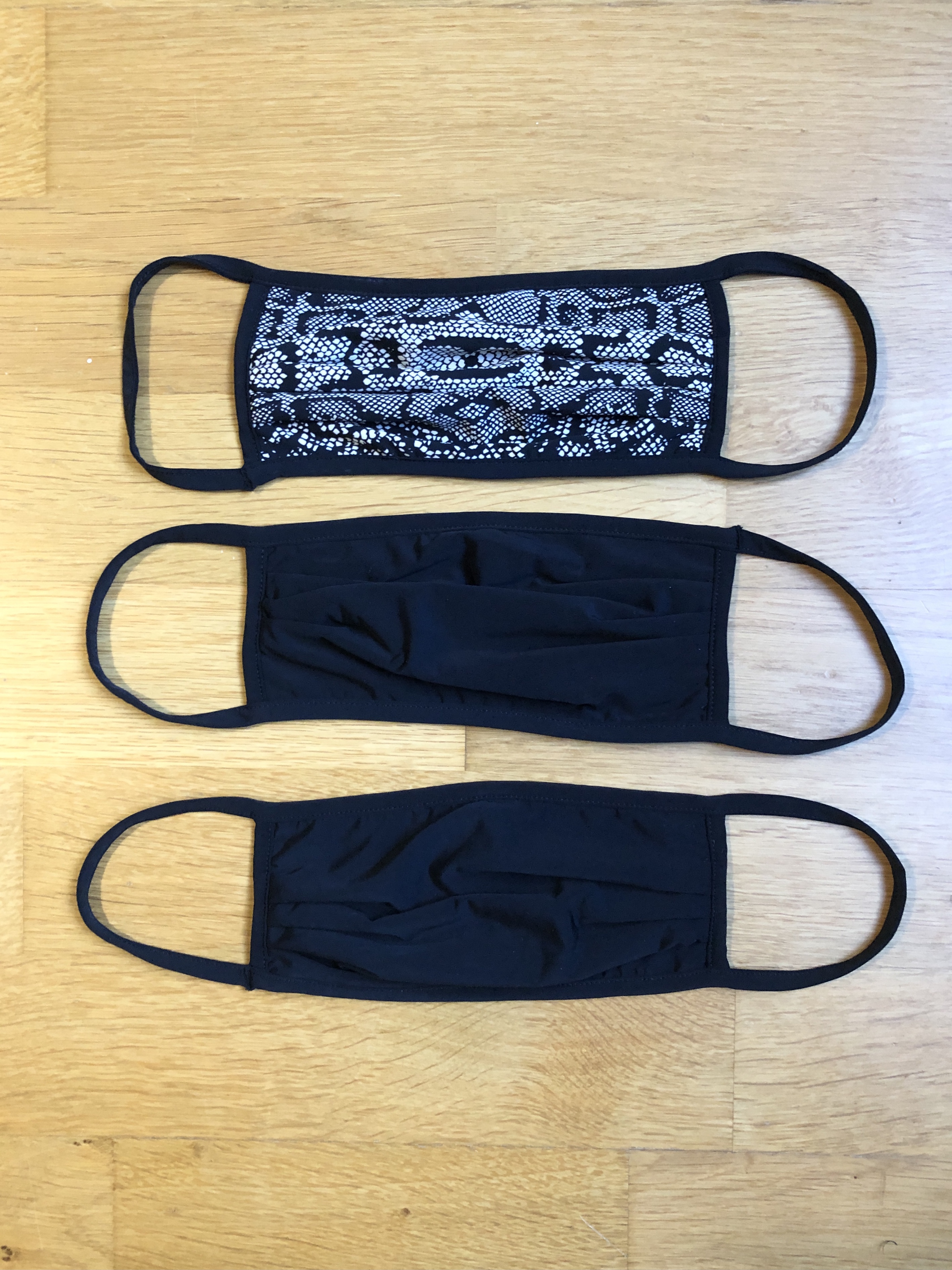 Undiz soldait toutes ses culottes à -50% et j’ai donc acheté 3 modèles (que je ne vous montrerai pas ici finalementà : une toute en dentelle blanche, une noir/or en transparence et un modèle sans couture violet. J’ai aussi racheté un pack de 3 masques car j’adore autant la forme que la matière (on dirait du tissus pour maillot de bain !) et dans celui-ci se trouvait 2 noirs et un avec un motif serpent noir/écru.