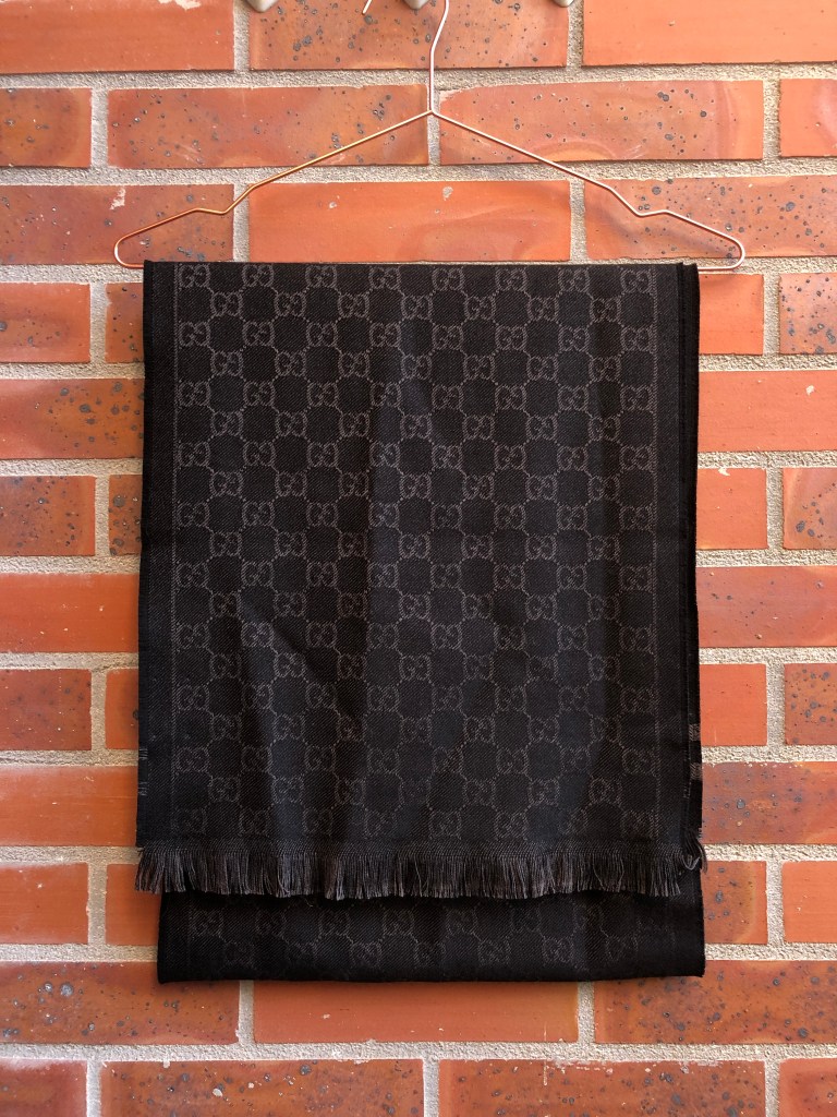 Lors d’une petite escapade à La Vallée Village je n’ai pas pu résister et je me suis offert une écharpe Gucci. Elle est totalement noire d’un côté et il y a le logo GG en gris foncé sur noir de l’autre, ça permet de la porter de 2 façons différentes. Ce que j’apprécie c’est qu’elle n’est pas trop encombrante, toutefois elle n’est pas très large ni épaisse et elle ne couvre parfois pas assez si j’ai un pull au col échancré.