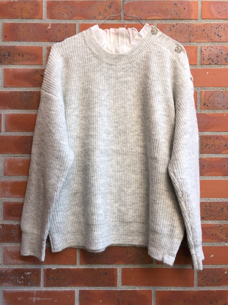 J’ai immédiatement crushé sur ce pull sur l’instagram de Lola and Co et je suis allée l’acheter le weekend dernier. Il est extrêmement doux et confortable. J’adore surtout les détails qui le rendent unique : les 3 boutons asymétriques en strass ainsi que le faux col blanc (attention au fond de teint par contre !).