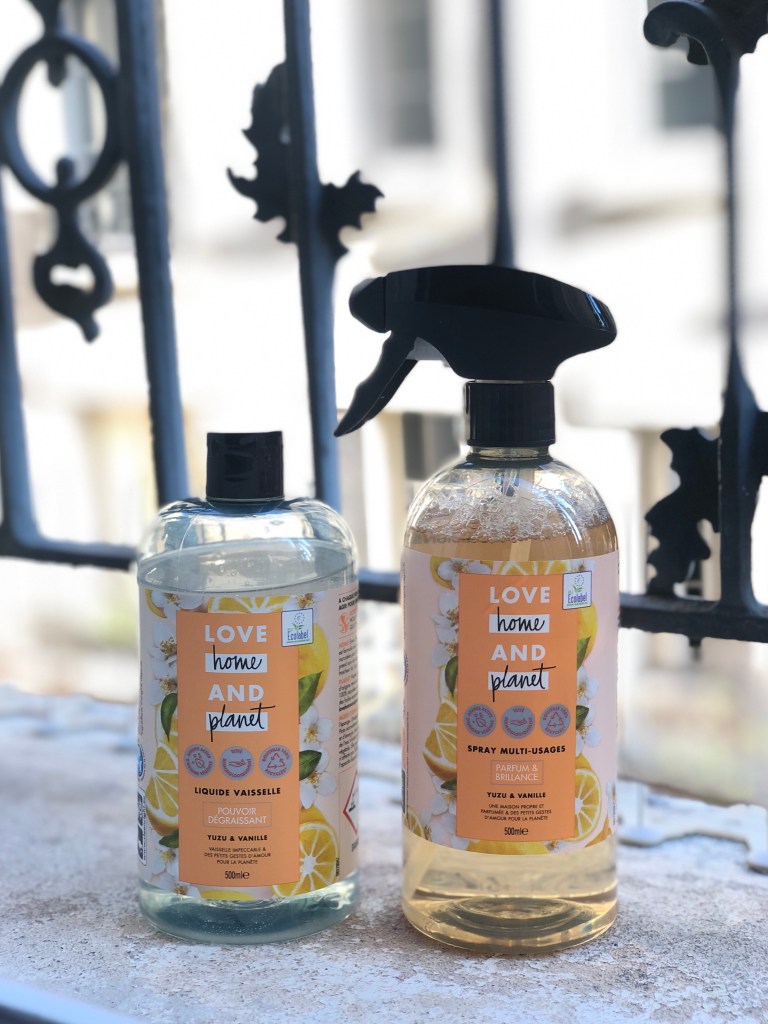 Comme moi, vous connaissiez sûrement déjà la marque de soins Love Beauty and Planet, mais vous peut-être ignoriez qu’ils avaient une gamme de produits d’entretien disponible chez Monoprix. J’ai donc acheté leur liquide vaisselle et le spray nettoyant multi-usage, parfum yuzu et vanille (il existe aussi vétiver et thé vert). Les agents actifs sont d’origine végétale, les formules sont biodégradables et les bouteilles sont 100% recyclées/recyclables. Ils sentent bons, sont efficaces, bons pour nous et la planète et les packagings sont plutôt jolis pour des produits ménagers, que demander de plus ?