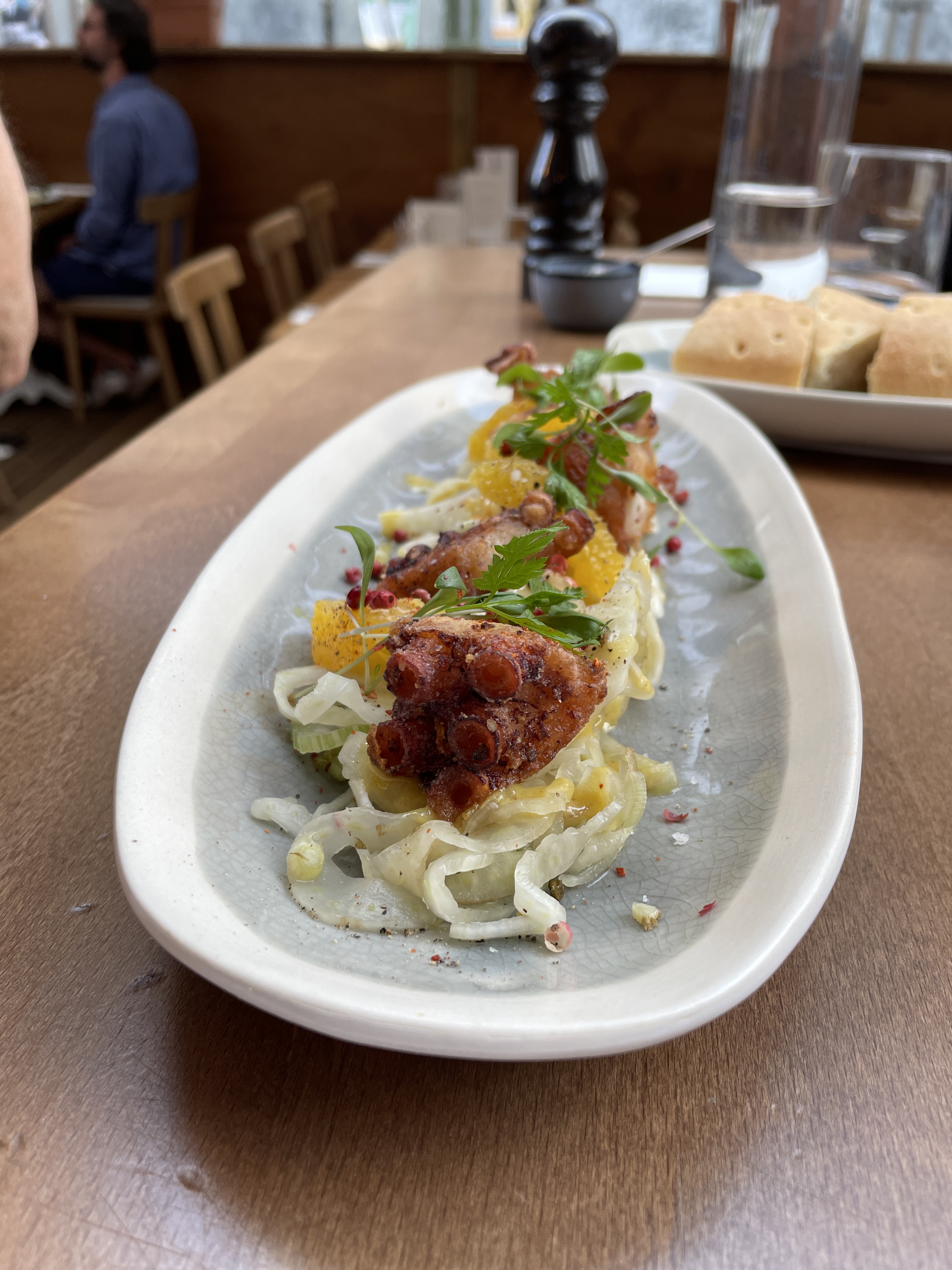 Mention spéciale en entrée pour cet incroyable poulpe frit, vinaigrette à l’orange et sa salade de fenouil alors que j’ai horreur de ça habituellement. Le houmous vert est idéal à partager car servi en quantité (avec de la foccacia).