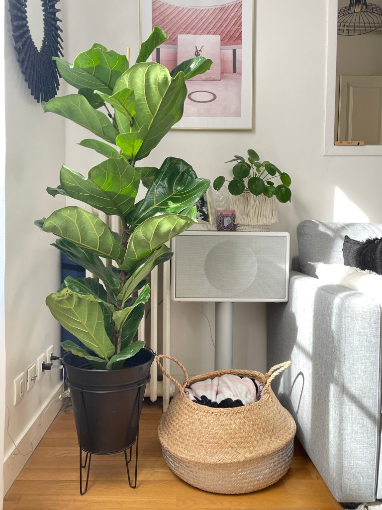 Nouvelle plante qui a rejoint mon intérieur avant l’été, ce très grand Ficus Lyrata acheté pour seulement 10€ chez Lidl ! Je trouve cette plante verte superbe, elle demande peu d’entretien (pas d’exposition directe au soleil, température entre 15 et 25° et arrosage lorsque la terre est sèche) et prend beaucoup moins de place qu’un bananier ou qu’un monstera par exemple. Vous aimez ?