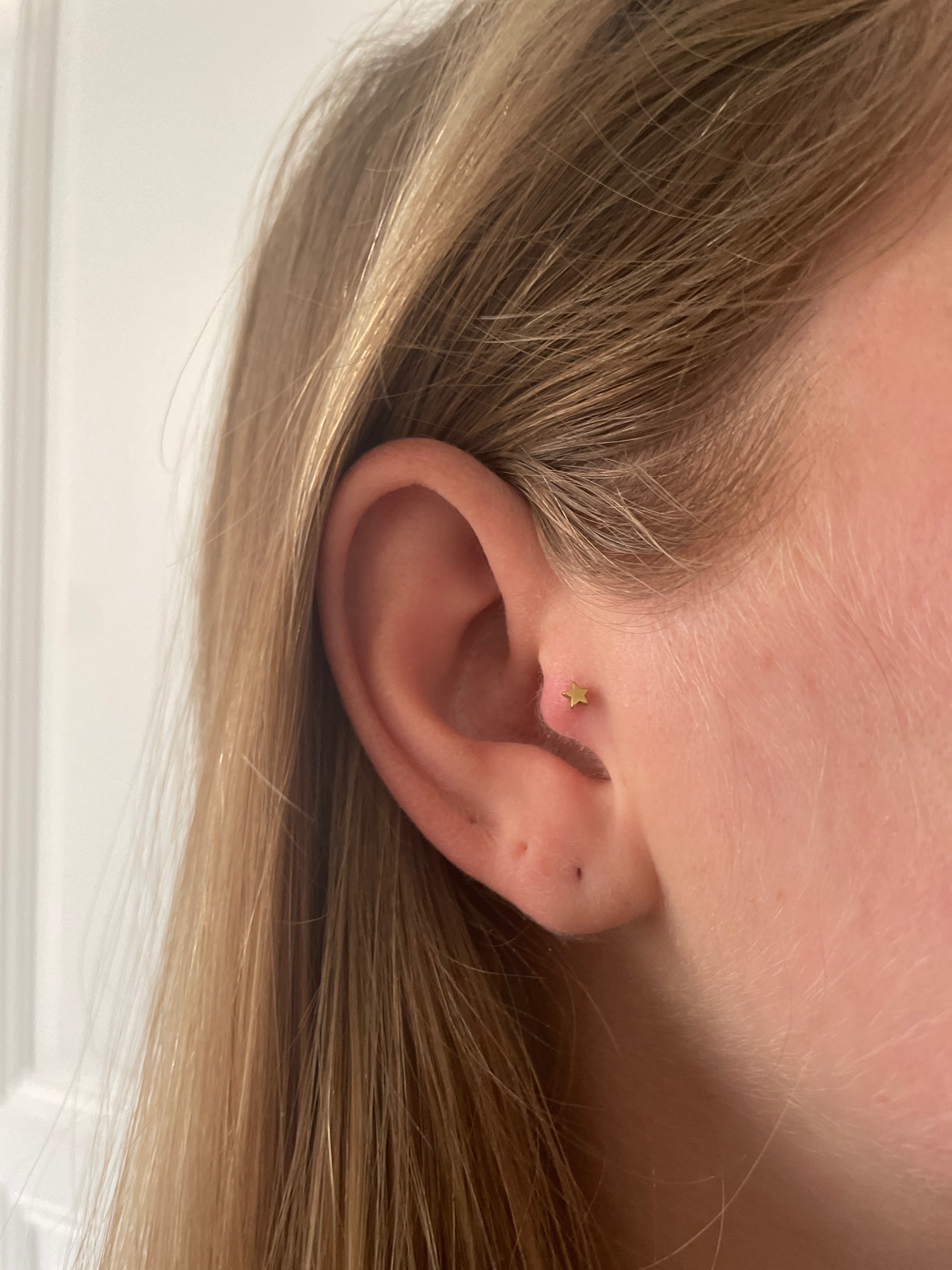 Je ne sais pas pourquoi j’ai encore eu un moment de folie, j’ai décidé de profiter du corner Maison Dorée au Bon Marché pour me faire un piercing au cartilage. J’ai opté pour le tragus car c’est un piercing que je trouve très joli et entre les cheveux, le port du masque et le sommeil, je me suis dit que serai le plus pratique (je n’avais toutefois pas anticipé le port des écouteurs !). Je n’avais pas encore franchi le cap, craignant la longue et douloureuse cicatrisation, toutefois j’ai été motivée à le faire au corner Maison Dorée par 2 raisons : le choix de prothèse (un éclair, une étoile ou un strass, doré ou argenté, plutôt que l’habituelle boule en acier gris) et l’utilisation d’un spray froid tellement efficace que je n’ai RIEN senti ! Et je peux vous dire que ça change la donne, car je suis très douillette et je pense que le cartilage doit faire TRÈS mal. Je fais donc soigneusement mes soins, espérant que le piercing cicatrise assez vite et ne s’infecte pas, mais pour l’instant à part un petit gonflement je le supporte plutôt bien !