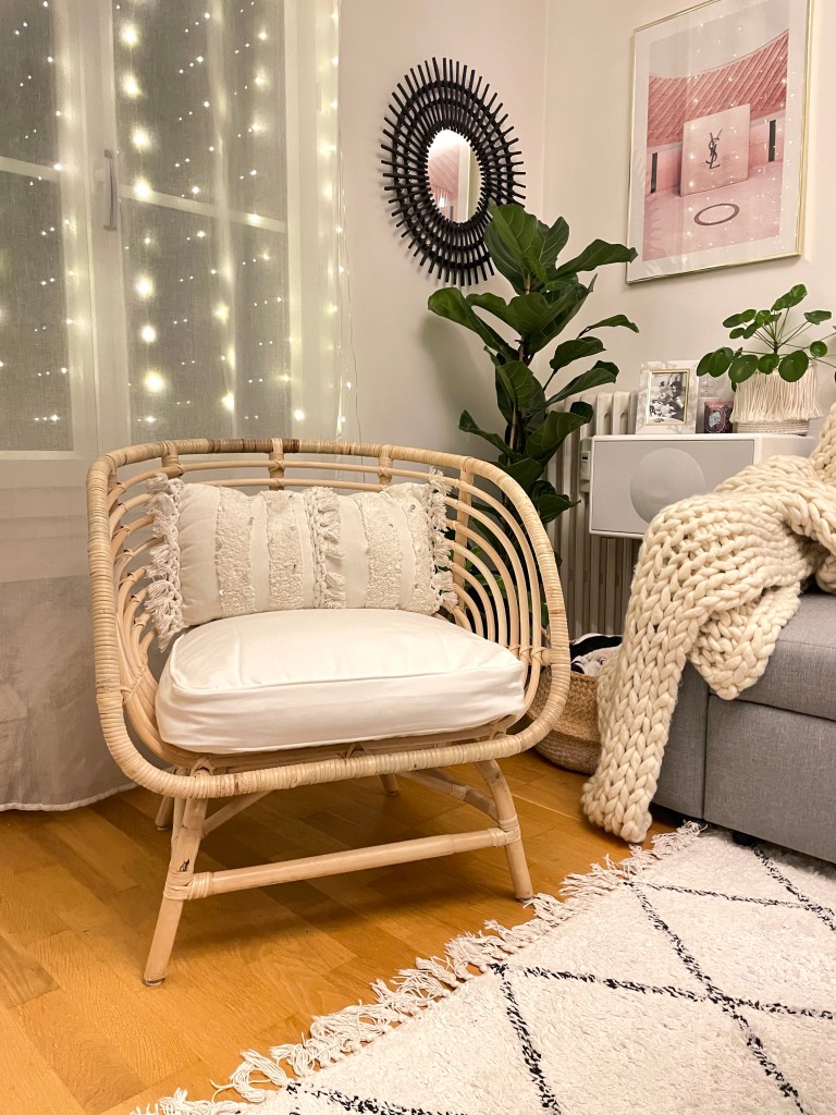 Ma dernière acquisition déco c’est ce très joli fauteuil en rotin signé Ikéa, modèle Buskbo. J’en voulais un depuis quelques semaines et je m’y suis prise au bon moment car c’est désormais la rupture de stock totale (j’ai eu l’avant-dernier d’Ile de France). Il est assez volumineux mais il fait son petit effet et je vous conseille d’acheter le coussin d’assise vendu séparément, pour plus de confort. Après, libre à vous d’y ajouter d’autres coussins pour le dos, un plaid ou mêmes une guirlande lumineuse…