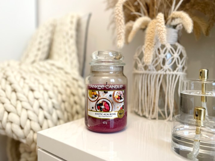 Je suis une grande fan de bougies parfumées et j’ai eu la chance de recevoir un joli portage de la marque Yankee Candle il y a quelques jours. Parmi les 3 grandes jarres que j’ai reçues, celle qui a le plus attiré mon attention et que je n’ai pas arrêté de faire brûler c’est la senteur Exotic Açaï Bowl, qui sent les fruits rouges, le lait et l’acidité des fruits exotiques. L’odeur est exquise et je ne m’en lasse pas même si je pense que je vais peut-être la réserver pour la belle saison !