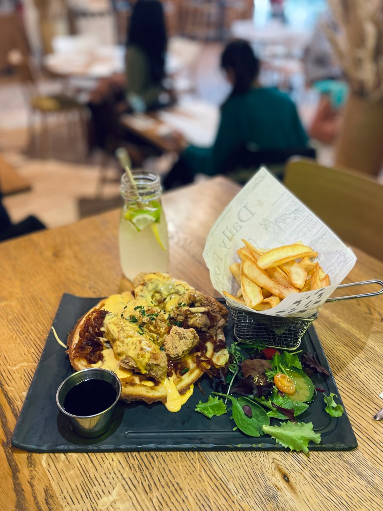 Lorsque je suis allée à NY il y a 2 ans, un plat m’a vraiment marquée : une gaufre servie avec du poulet frit et du sirop d’érable. Et le weekend dernier j’ai été étonnée de le retrouver chez Crepe Touch à Créteil Soleil. La recette est la même sauf qu’ils y ajoutent du cheddar fondue et des oignons caramélisés (personnellement j’ai fait remplacer la sauce BBQ par du sirop), et c’était incroyablement bon ! Je vous recommande aussi leur citronnade qui est très réussie.