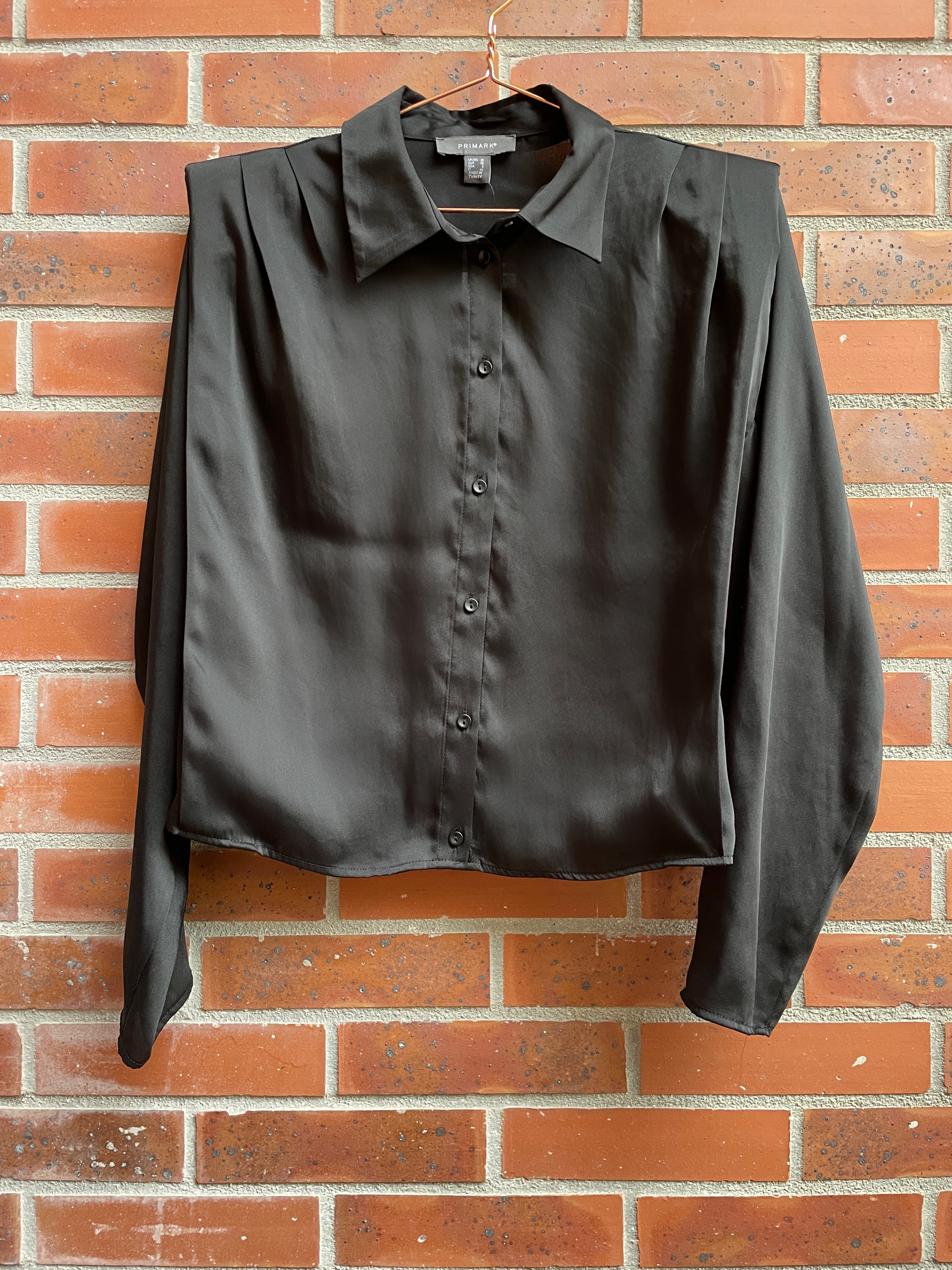 J’ai aussi craqué sur cette chemise noire en matière satinée, très chic. Ce que j’ai beaucoup aimé c’est l’effet d’épaulettes, qui lui donne de la prestance, aussi bien sur un jean que rentrée dans une jupe.