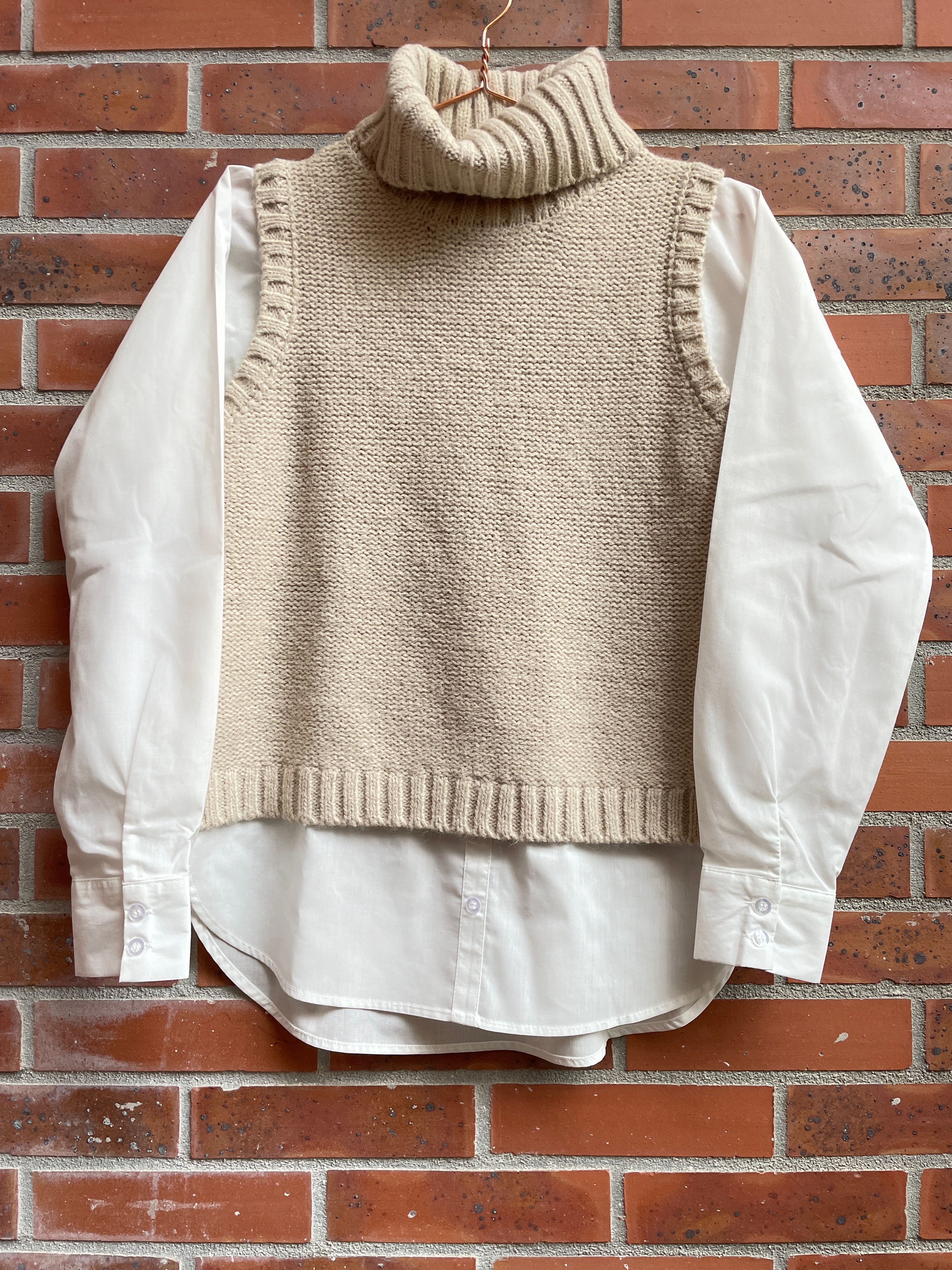 J’ai trouvé ce combo assez sympa. En gros c’est une fausse chemise (il n’y a que les bras et les parties inférieures) sur laquelle on aurait superposé un pull col roulé sans manche. Je l’ai pris en beige mais il existe aussi en kaki clair pour celles qui aiment le modèle.