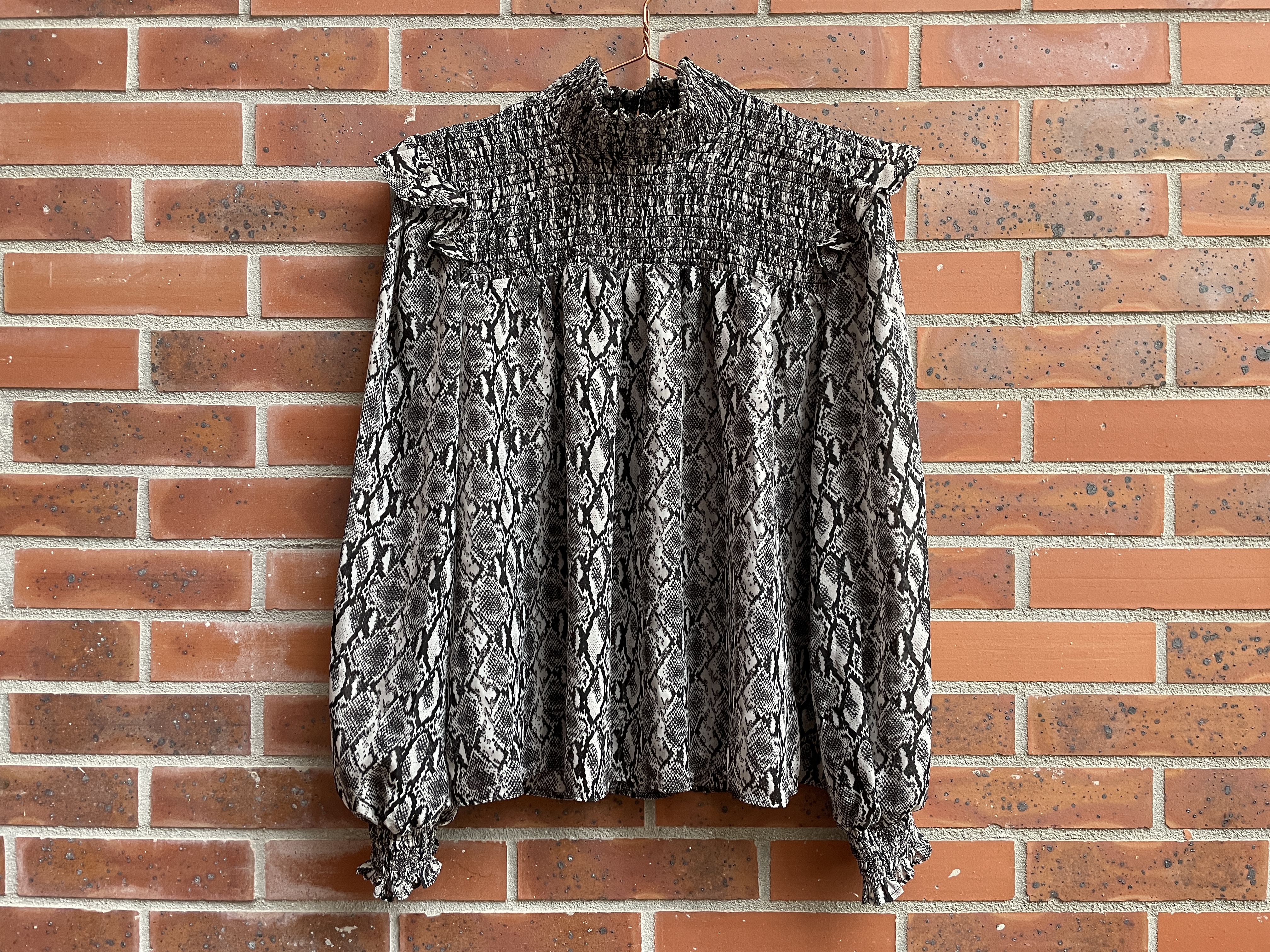 J’aime beaucoup ce type de blouses toutes simples qu’on trouve chez Primark. J’en ai une en léopard, une autre avec un imprimé fleuri et je complète ma collection avec cet imprimé serpent. Comme elle est en voila, il y a un effet de transparence mais on ne voit pas du tout vos sous vêtements une fois que vous la portez (et vous pouvez mettre un débardeur en dessous pour ne pas avoir trop froid).