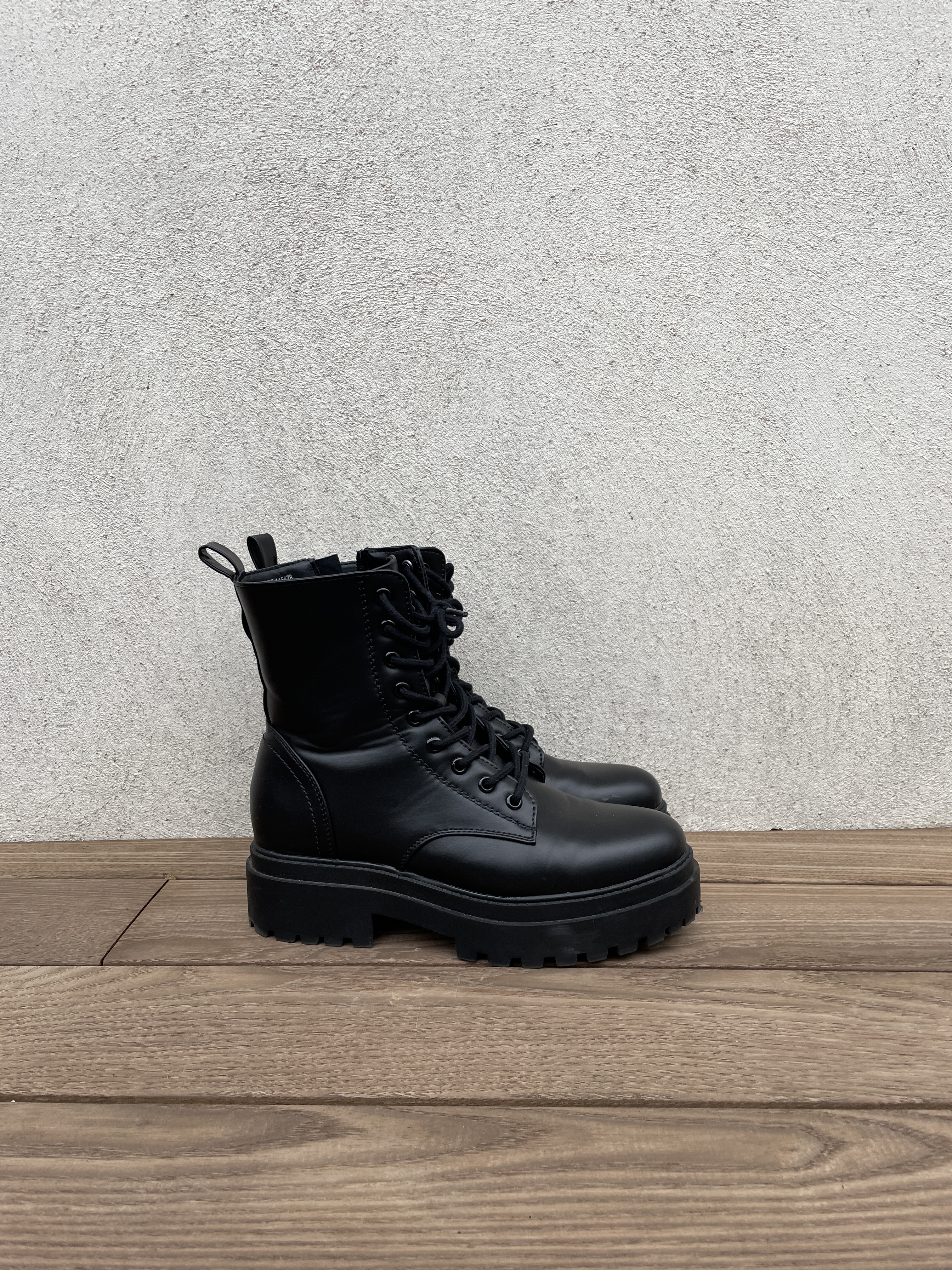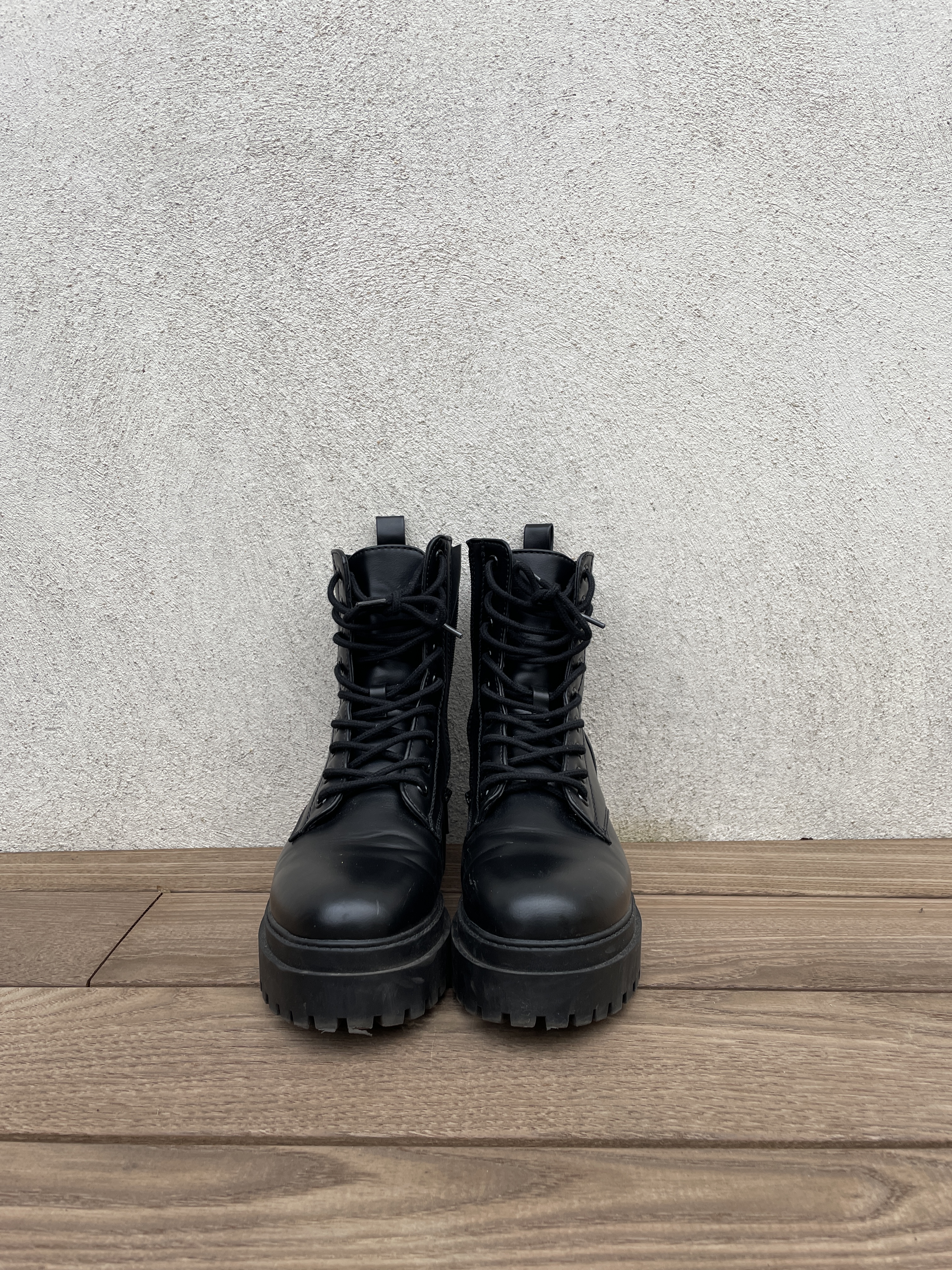 J’ai un truc avec les boots plates noires… J’en achète une à deux paires chaque automne et il m’arrive souvent de trouver mon bonheur chez Pimkie ou Primark. J’ai choisi ce modèle car elles n’ont pas de finitions métalliques dorées/argentées mais sont full black et que la semelle assez hautes me grandit de quelques centimètres. Et si vous vous posez la question : oui, elles sont très confortables.