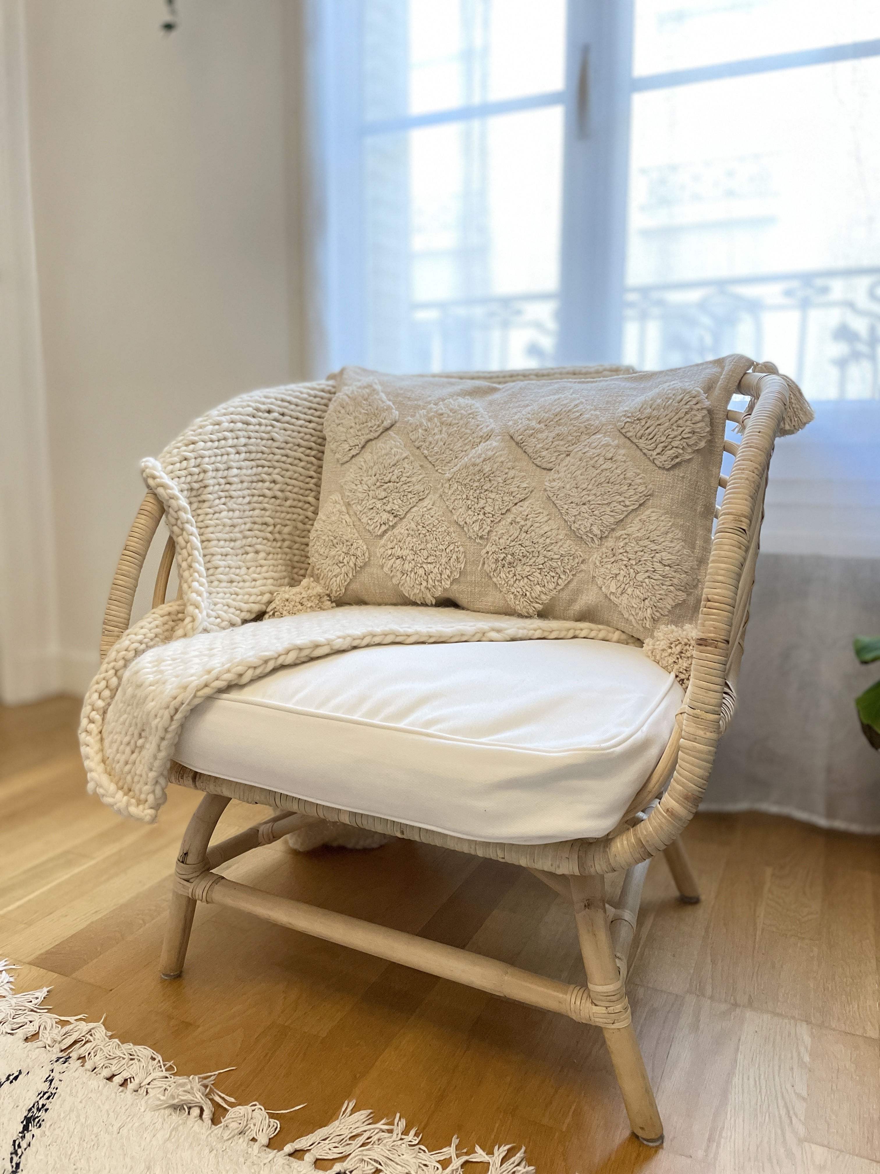 J’ai récemment acheté le fauteuil en rotin Buskbo chez Ikea, mais il manquait cruellement d’un coussin pour le dos. Ma maman m’a donc offert celui-ci, qu’on avait vu ensemble chez H&M Home (initialement en carré mais ça n’était pas idéal, donc je l’ai échangé contre le format rectangulaire) et il va parfaitement bien dessus.