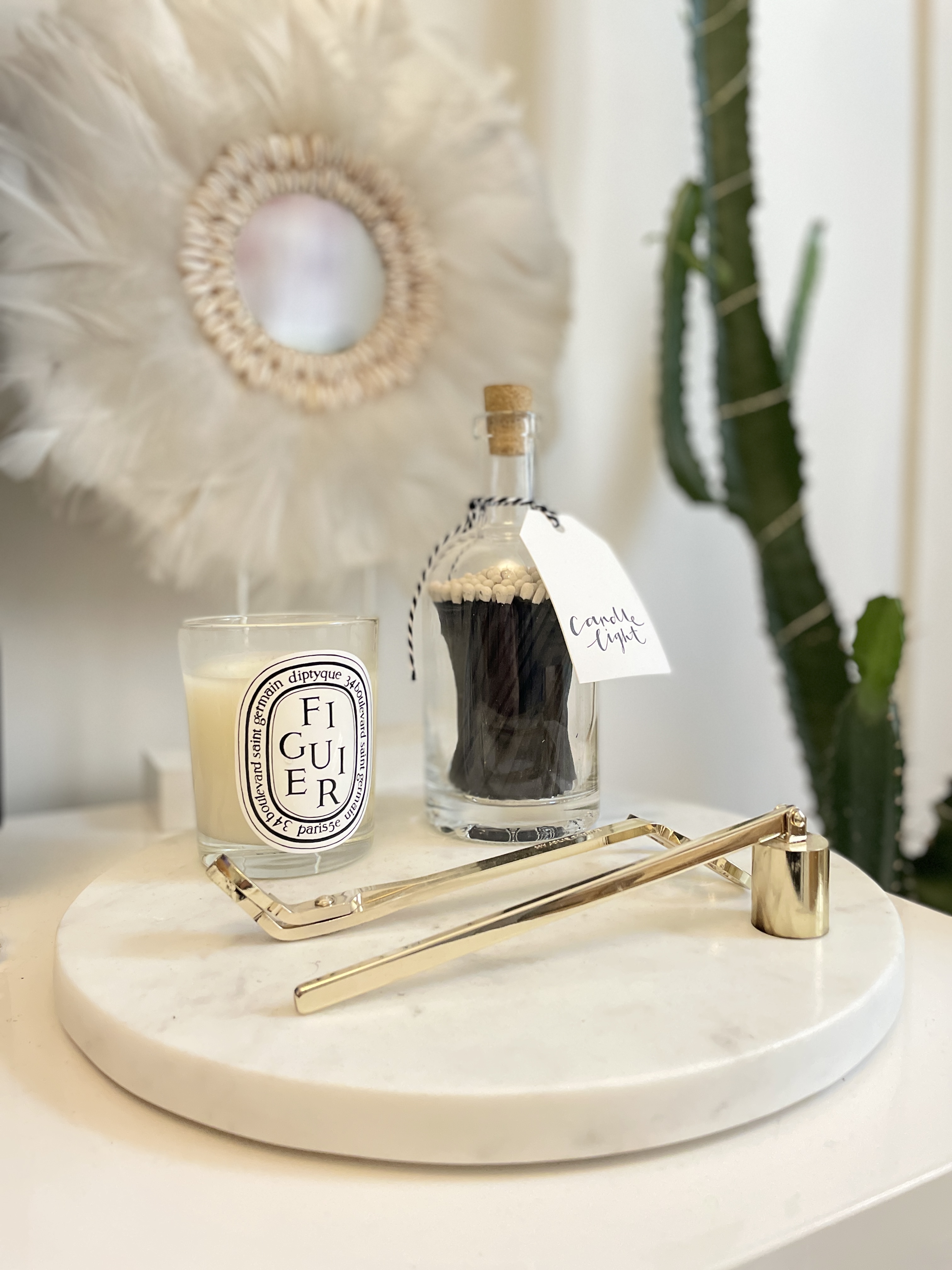 J’ai aussi reçu en cadeau un petit sous-verre en marbre (qui vient de chez Muy Mucho) que j’utilise plutôt pour y poser une bougie. Notamment ma plus récente acquisition, la bougie Anti-connards de la marque Felicie Aussi. Parce qu’elle me fait rire mais aussi car elle sent divinement bon la figue, l’une de mes odeurs préférées.