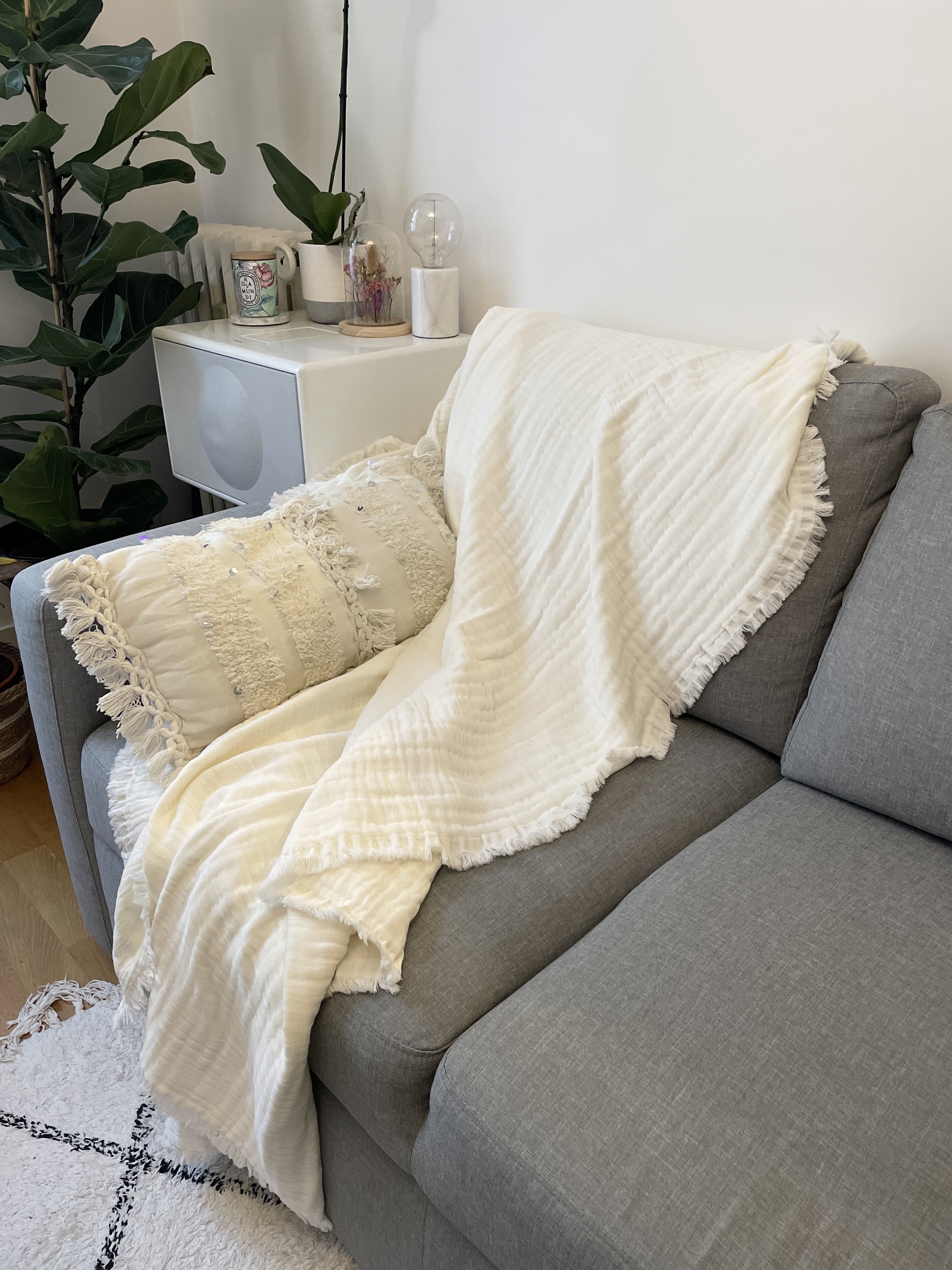 Ma soeur m’a offert ce très joli plaid/jetée de canapé que j’avais vu dans un magasin et pour laquelle j’avais eu un coup de coeur. Il est en gaze de coton blanc, assez épais, avec des franges aux extrémités, vraiment très cocooning et minimaliste à la fois. Maintenant je challenge ça va être de le garder blanc !
