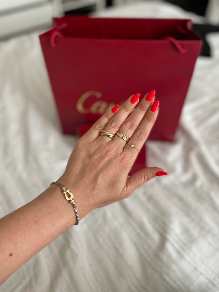 J’ai reçu cette bague comme cadeau (financé en partie par moi-même) pour mon anniversaire cette année et je la voulais depuis tellement longtemps, si vous saviez… Grâce à un contact, j’ai fait une super affaire en l’achetant d’occasion et en très très bon état (je suis tout de même allée chez Cartier la faire authentifier, on ne sait jamais). Par chance c’était pile ma taille et la couleur d’or que je voulais. Plus qu’à targeter le bracelet qui va avec maintenant !