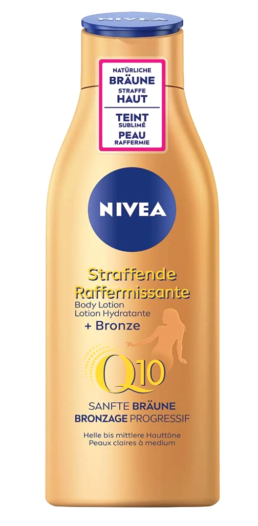 Lait-huile corps et Lait hydratant Fermeté + Halé Q10 NIVEA, 3,80€ et 5,50€