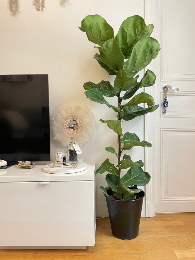 Je pense que mon précédent Ficus n’a pas du tout apprécié son spot devant le radiateur et il a donc perdu beaucoup de ses feuilles à la fin de l’hiver, ce qui le rendait un peu chétif (je l’ai donné sur Geev). Coup de chance, ma mère était chez Lidl pile le jour où ils en avaient à nouveau (ce qui n’arrive je crois qu’une fois par an) et m’en a pris un nouveau. Je lui ai trouvé une place plus ensoleillée et éloignée du radiateur, et je suis trop contente d’en avoir un nouveau car c’est une plante assez haute, qui rappelle le figuier, et qui décore très bien un intérieur.