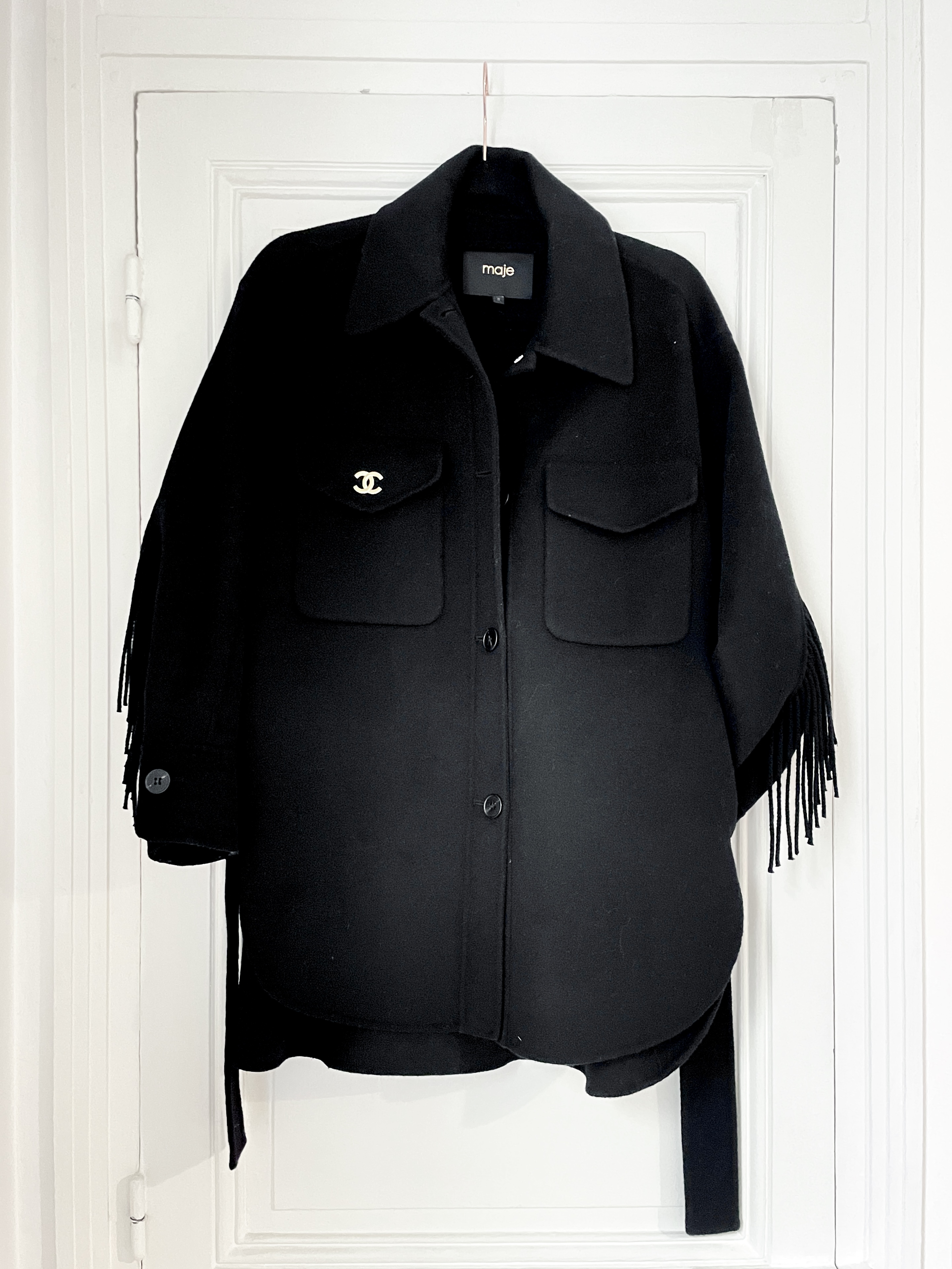 Fin septembre je suis allée à La Vallée Village et j’ai eu un énorme crush sur ce manteau Maje (qui n’était clairement pas donné, même au prix d’outlet). Je n’avais pas vraiment de manteau noir mi-saison, qui soit court donc ne tienne pas forcément trop chaud. Il est entièrement laine, se ferme à la taille avec une ceinture (que j’ai cousue à l’arrière car elle n’arrêtait pas de tomber et j’avais peur de la perdre) et ce que j’aime le plus ce sont les franges le long des bras, qui lui donnent un style vraiment original.